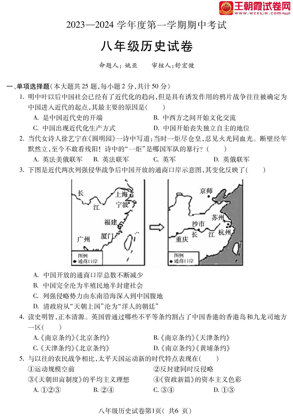 安徽省宣城市第六中学2023-2024学年度第一学期期中考试八年级历史(人教版)
