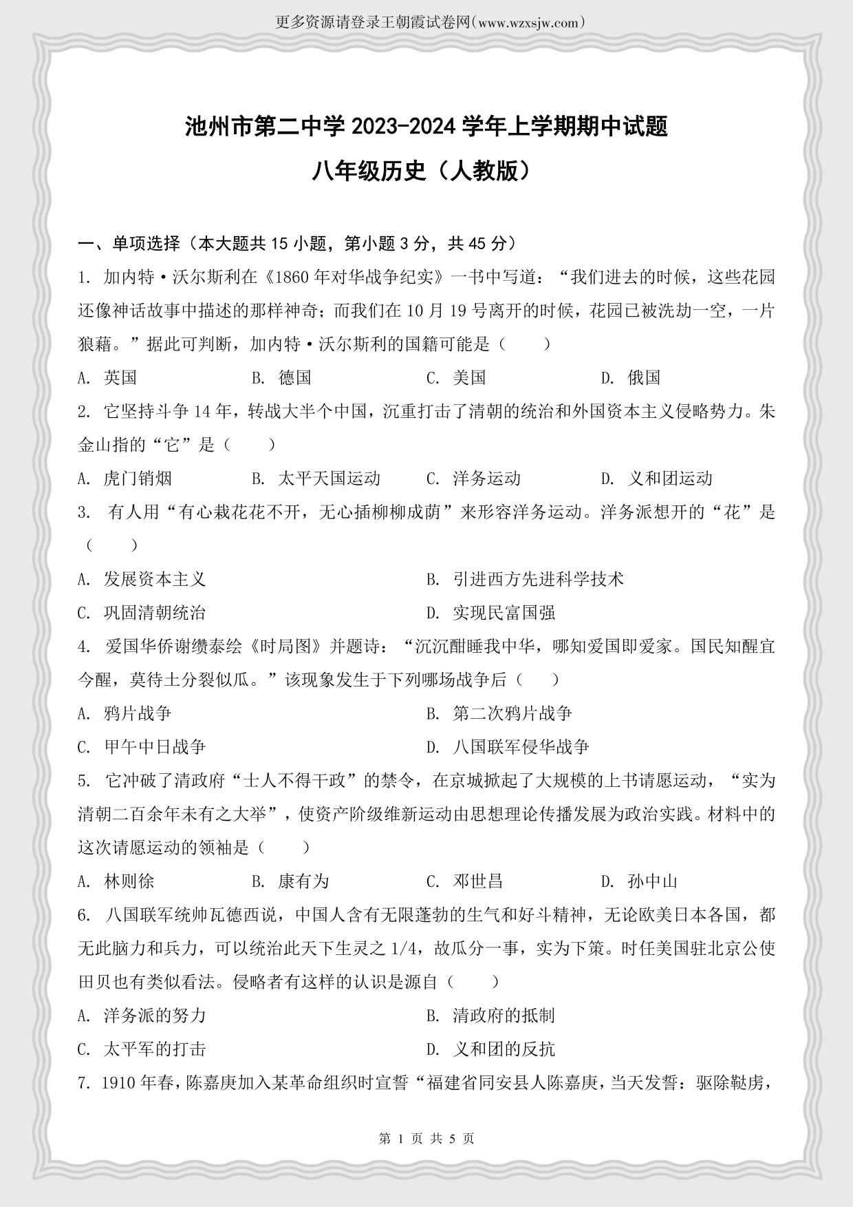 安徽省池州市第二中学2023-2024学年上学期期中试题八年级历史(人教版)