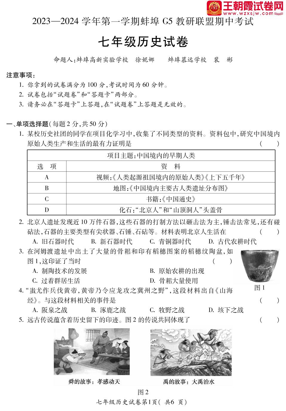 安徽省蚌埠市蚌山区G5教研联盟2023-2024学年第一学期期中考试七年级历史(人教版)