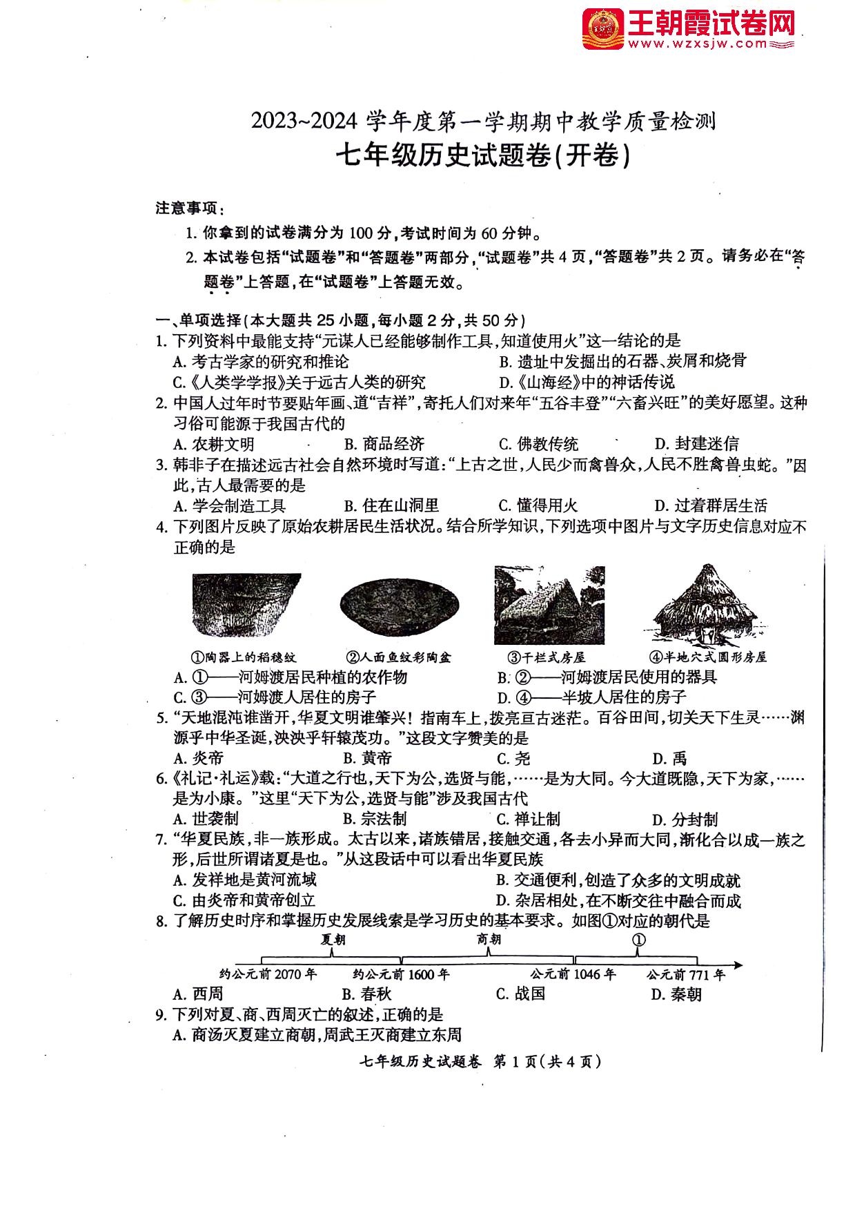 安徽省滁州市第六中学2023-2024学年度第一学期期中教学质量检测七年级历史(人教版)