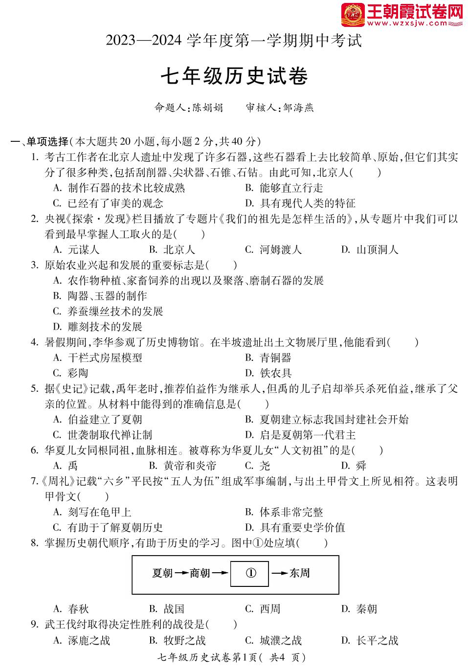 安徽省宣城市第六中学2023-2024学年度第一学期期中考试七年级历史(人教版)