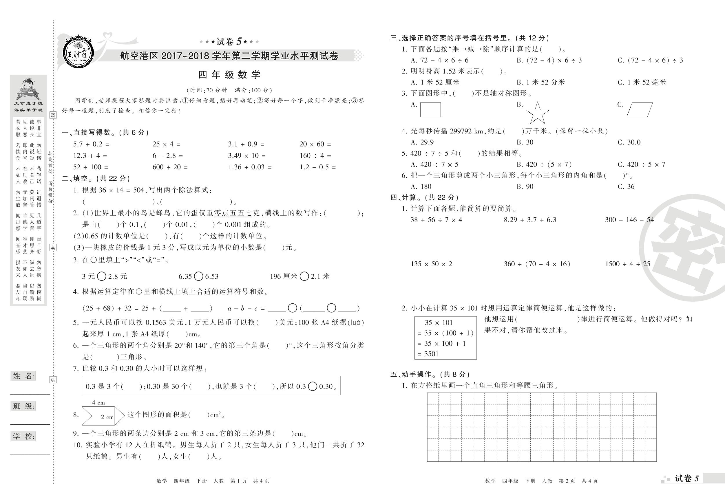 2017-2018学年第二学期郑州市航空港区四年级数学试卷(人教版)【5】