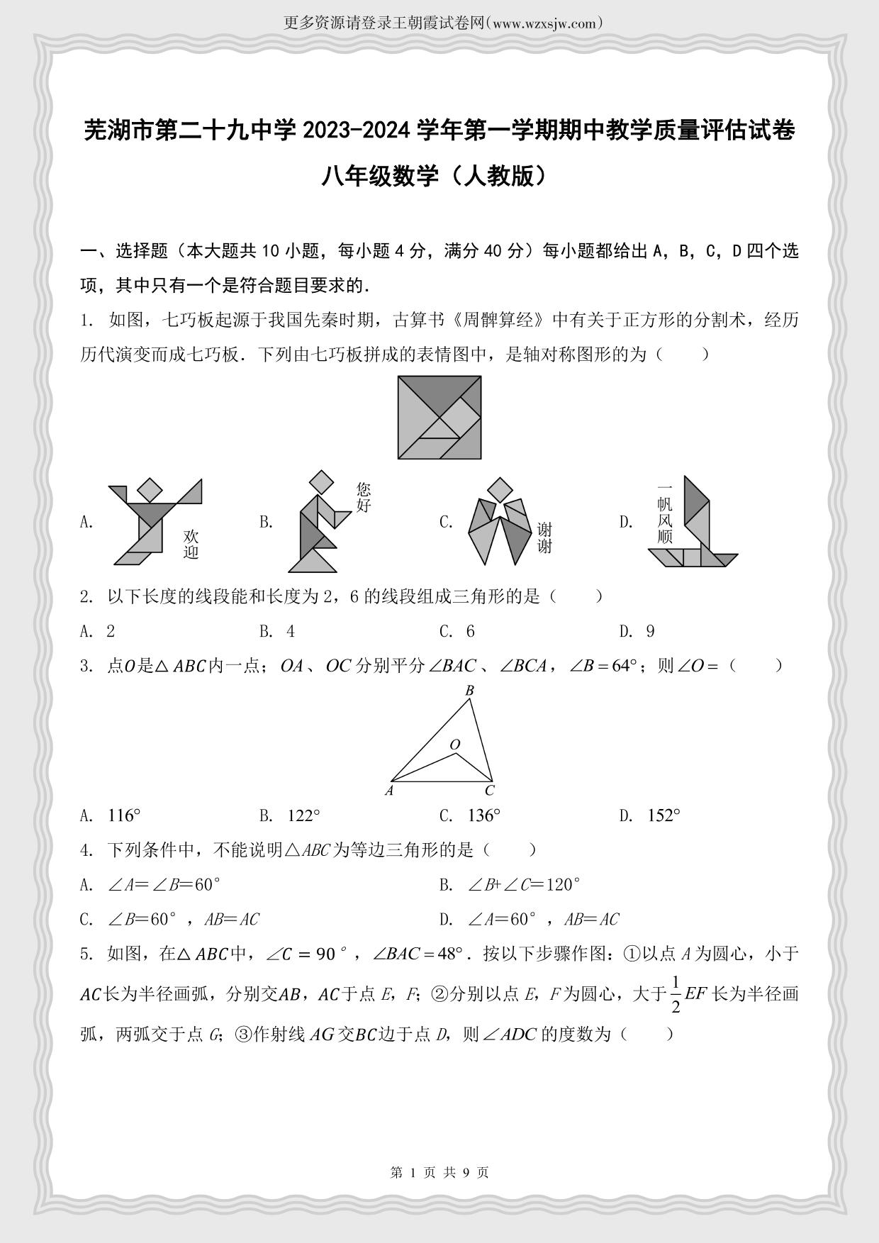 安徽省芜湖市第二十九中学2023-2024学年第一学期期中教学质量评估试卷八年级数学(人教版)