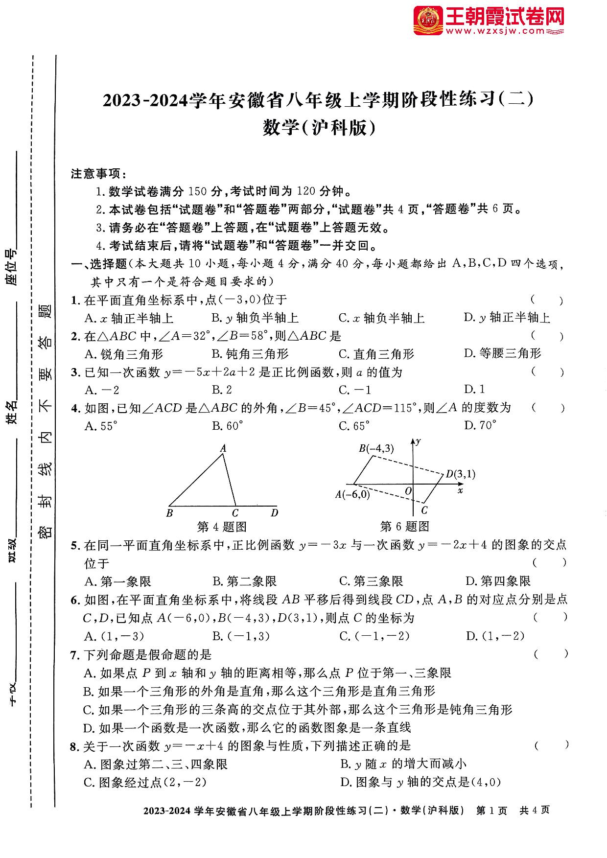 安徽省安庆市2023-2024学年上学期阶段性练习(期中)八年级数学(沪科版)