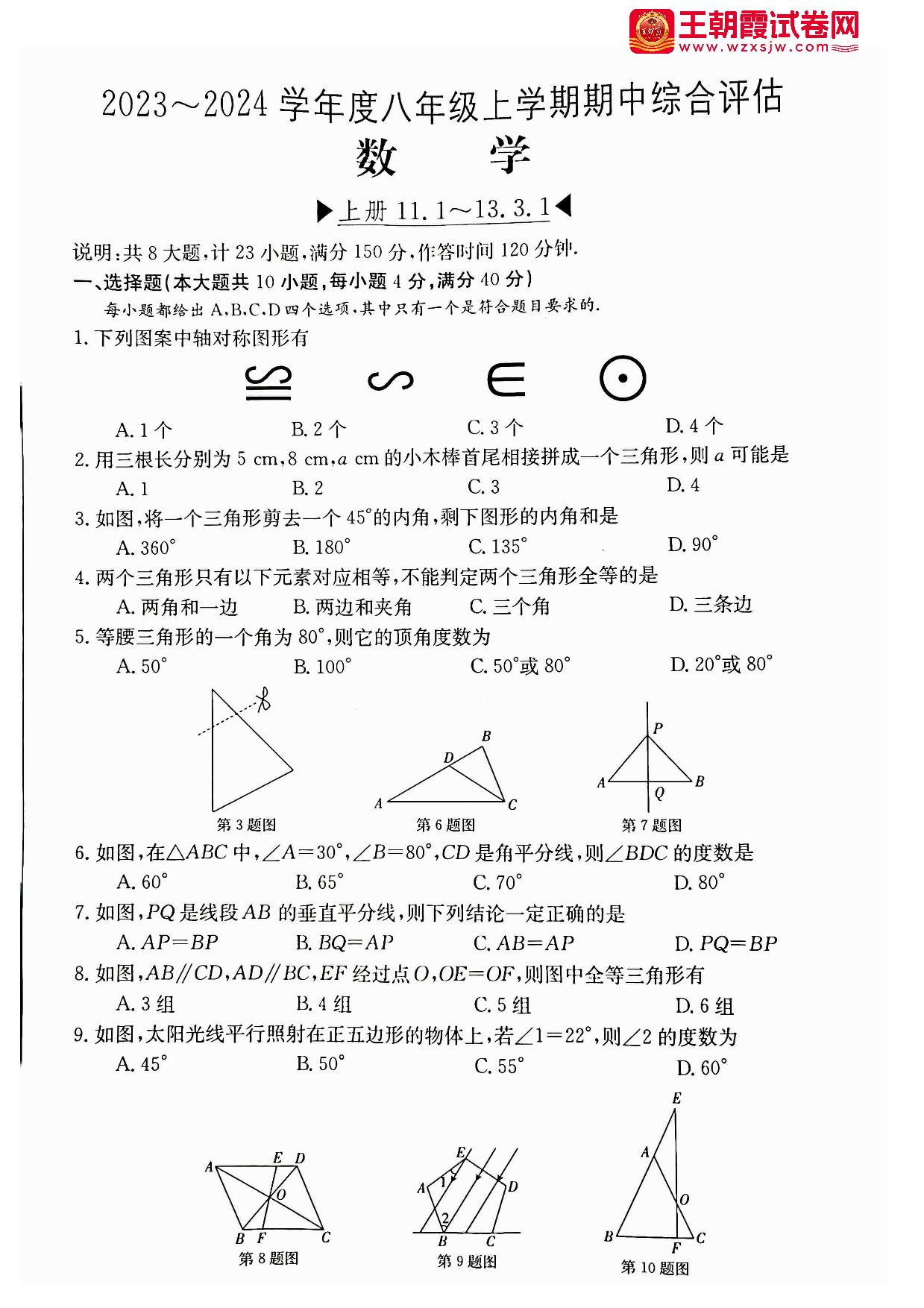 安徽省芜湖市无为市部分学校2023-2024学年度上学期期中综合评估八年级数学(人教版)