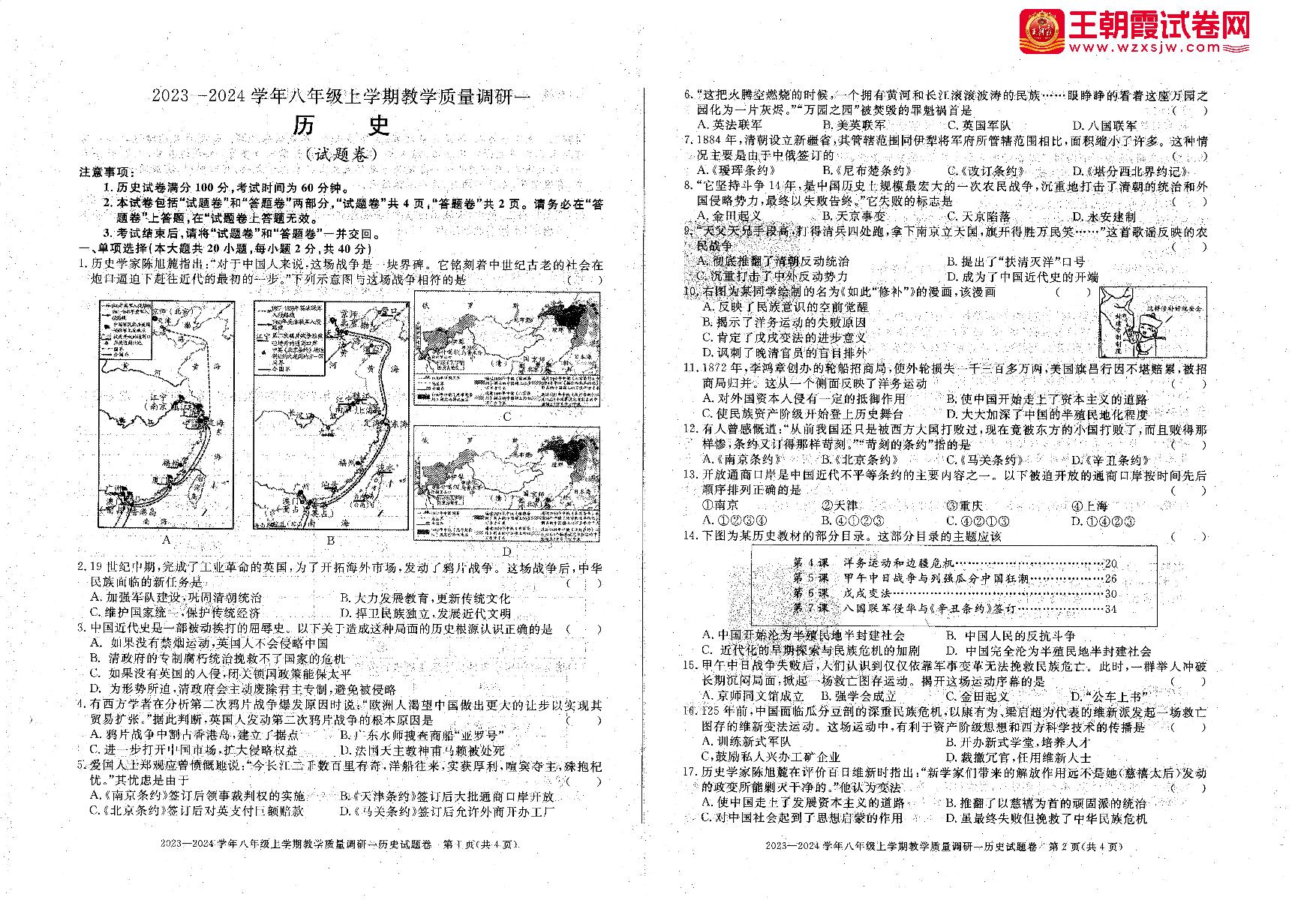 八年级历史人教版上册月考卷