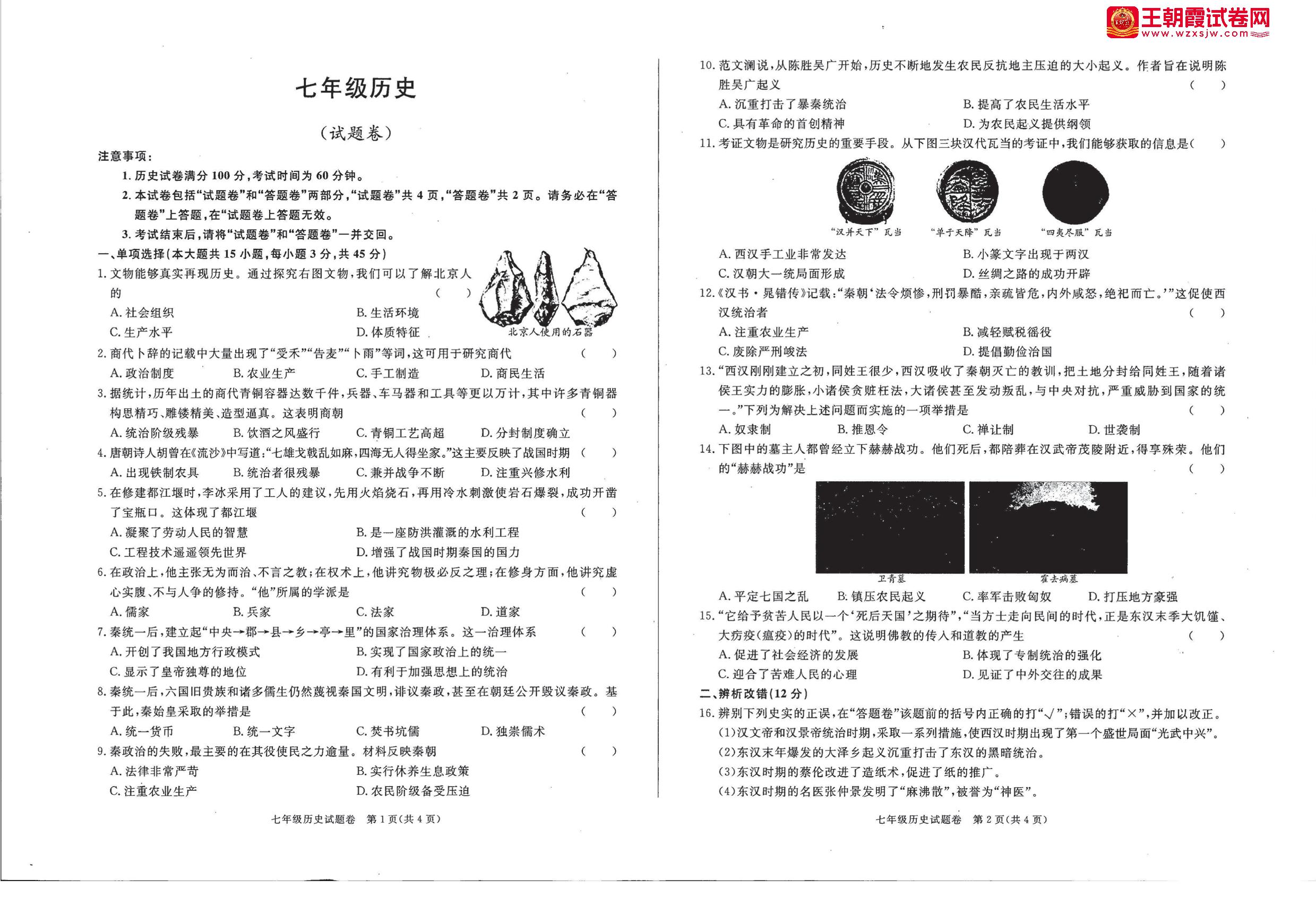 安徽省合肥市庐江县庐州学校2023-2024学年上学期12月月考试题七年级历史(人教版)