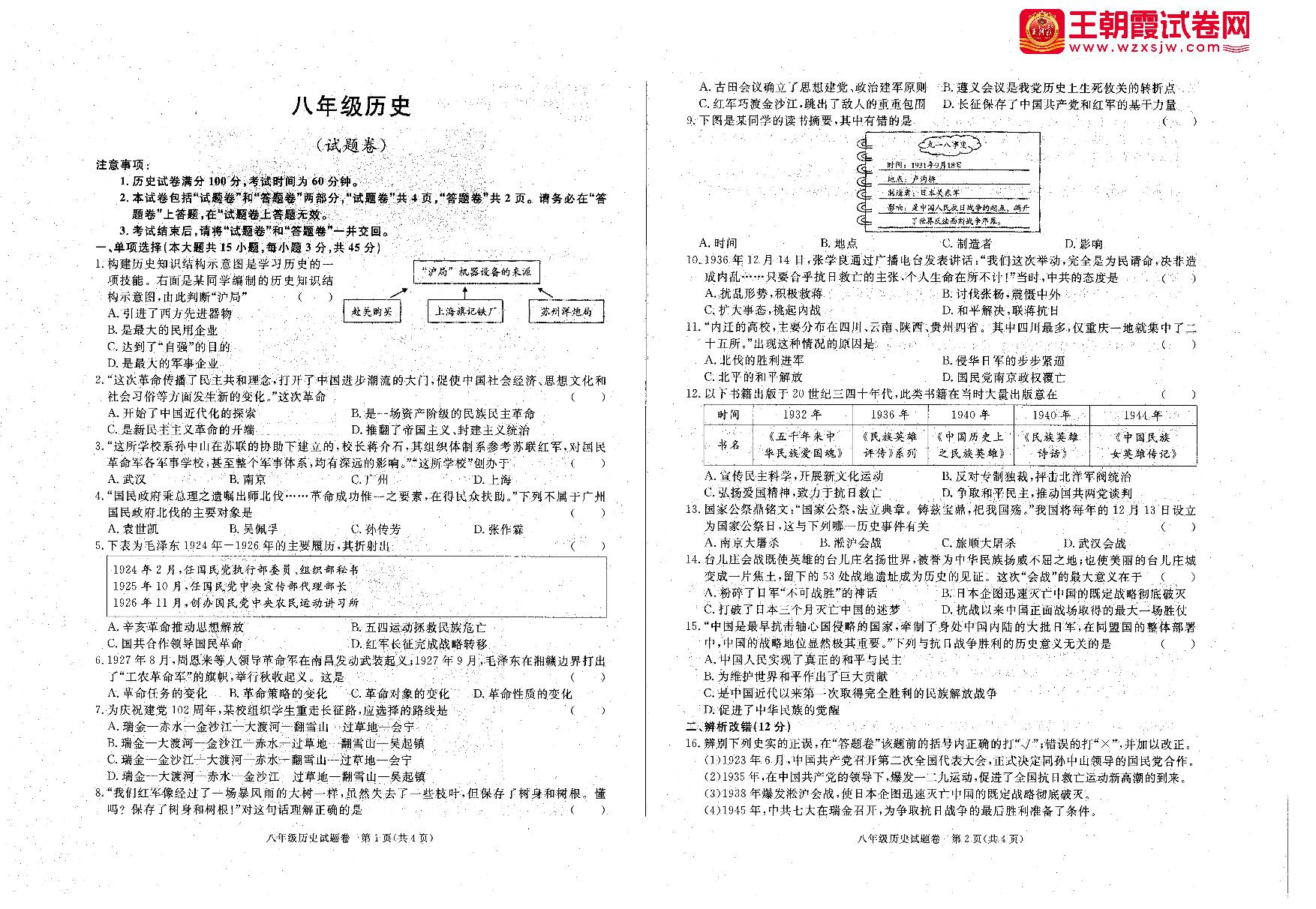 八年级历史人教版上册月考卷