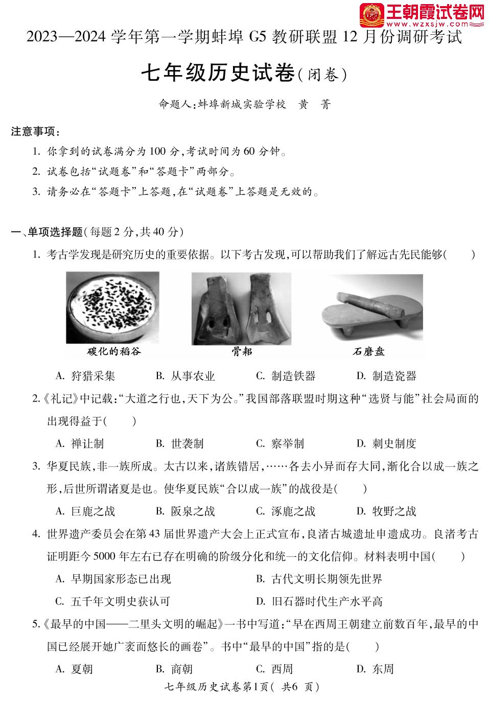 安徽省蚌埠市蚌山区G5教研联盟2023-2024学年第一学期12月份调研考试七年级历史(人教版)