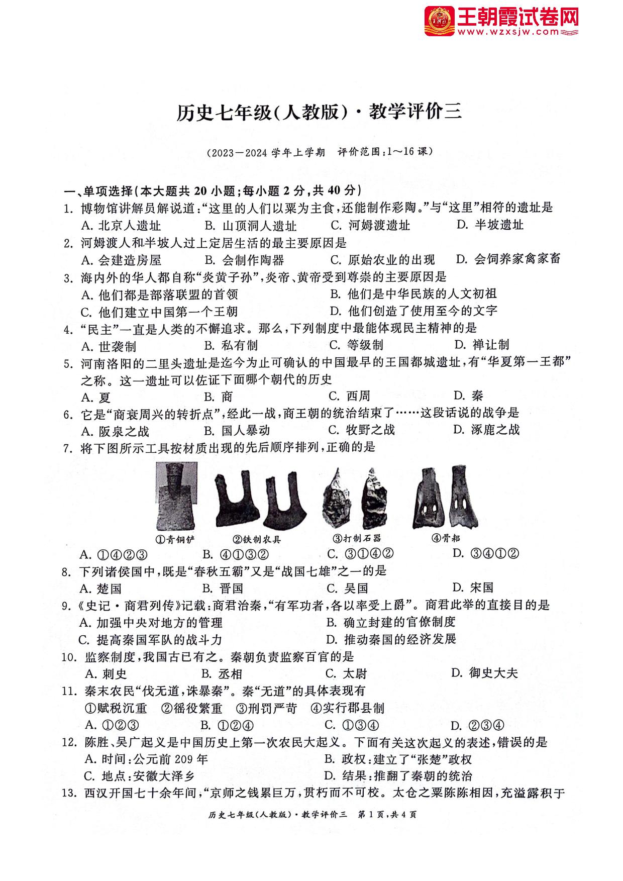安徽省淮北市五校联考2023-2024学年上学期(月考)教学评价三七年级历史(人教版)