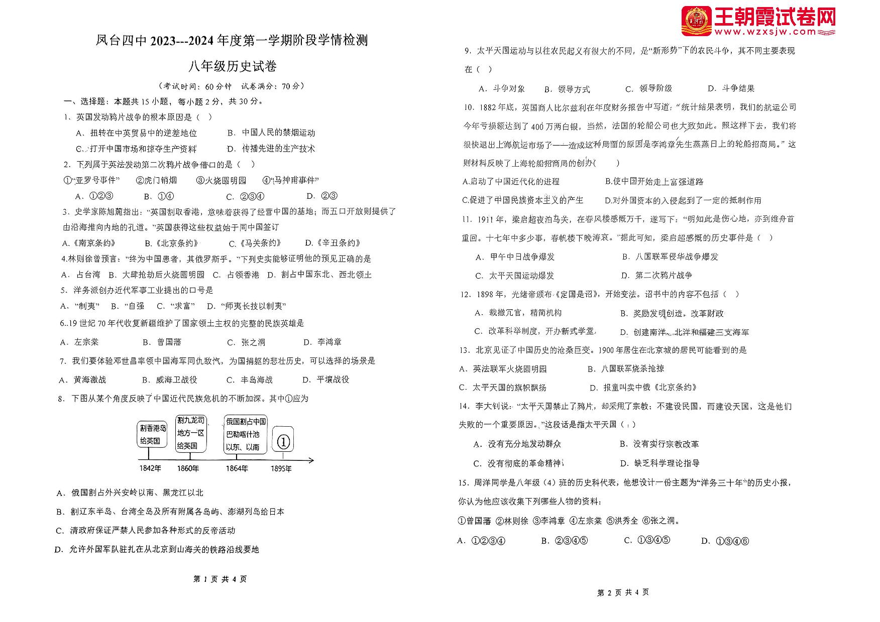 安徽省淮南市凤台县第四中学2023-2024学年度第一学期(月考)阶段学情检测八年级历史(人教版)