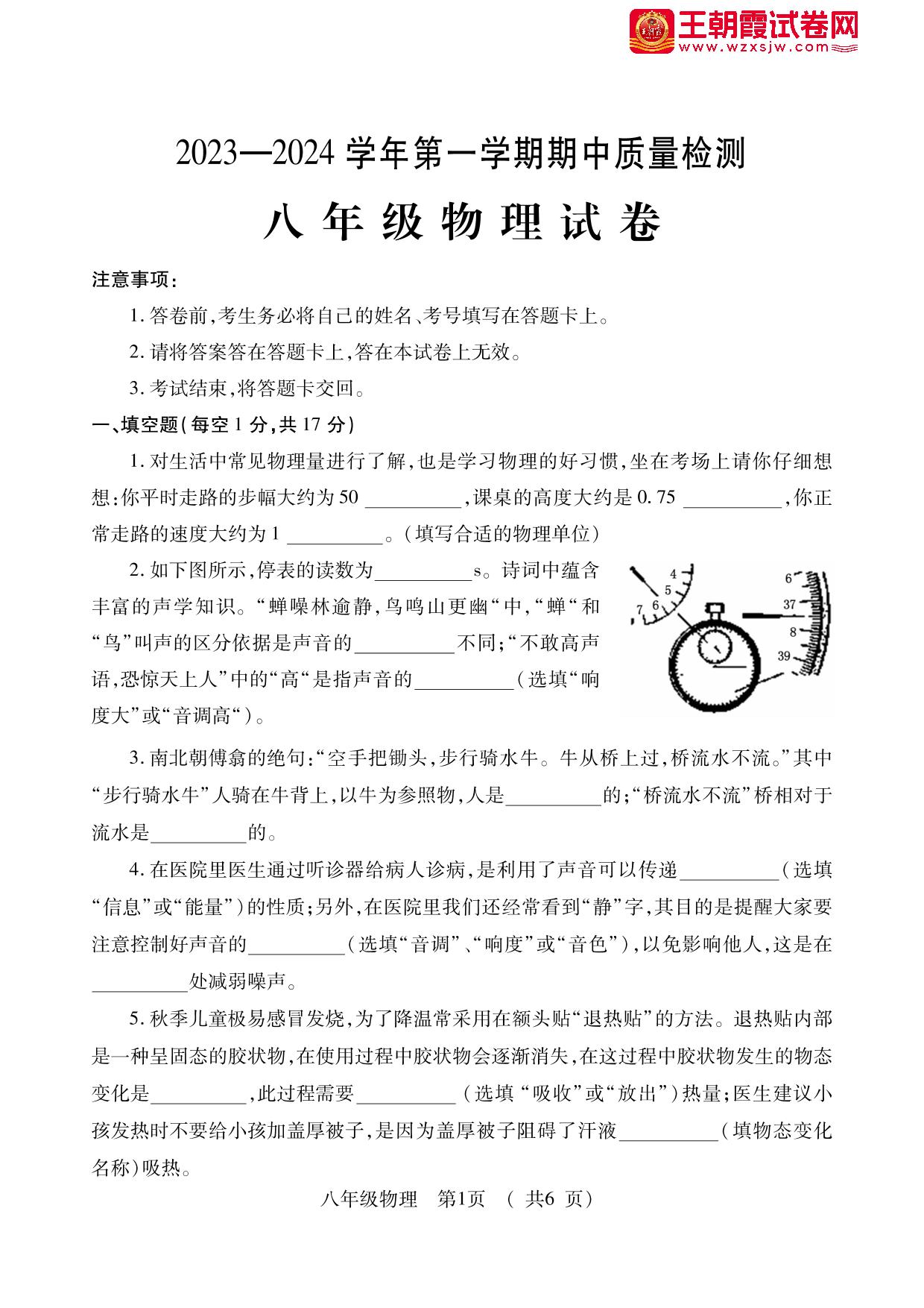 河南省洛阳市嵩县2023-2024学年第一学期期中质量检测试卷八年级物理(人教版)