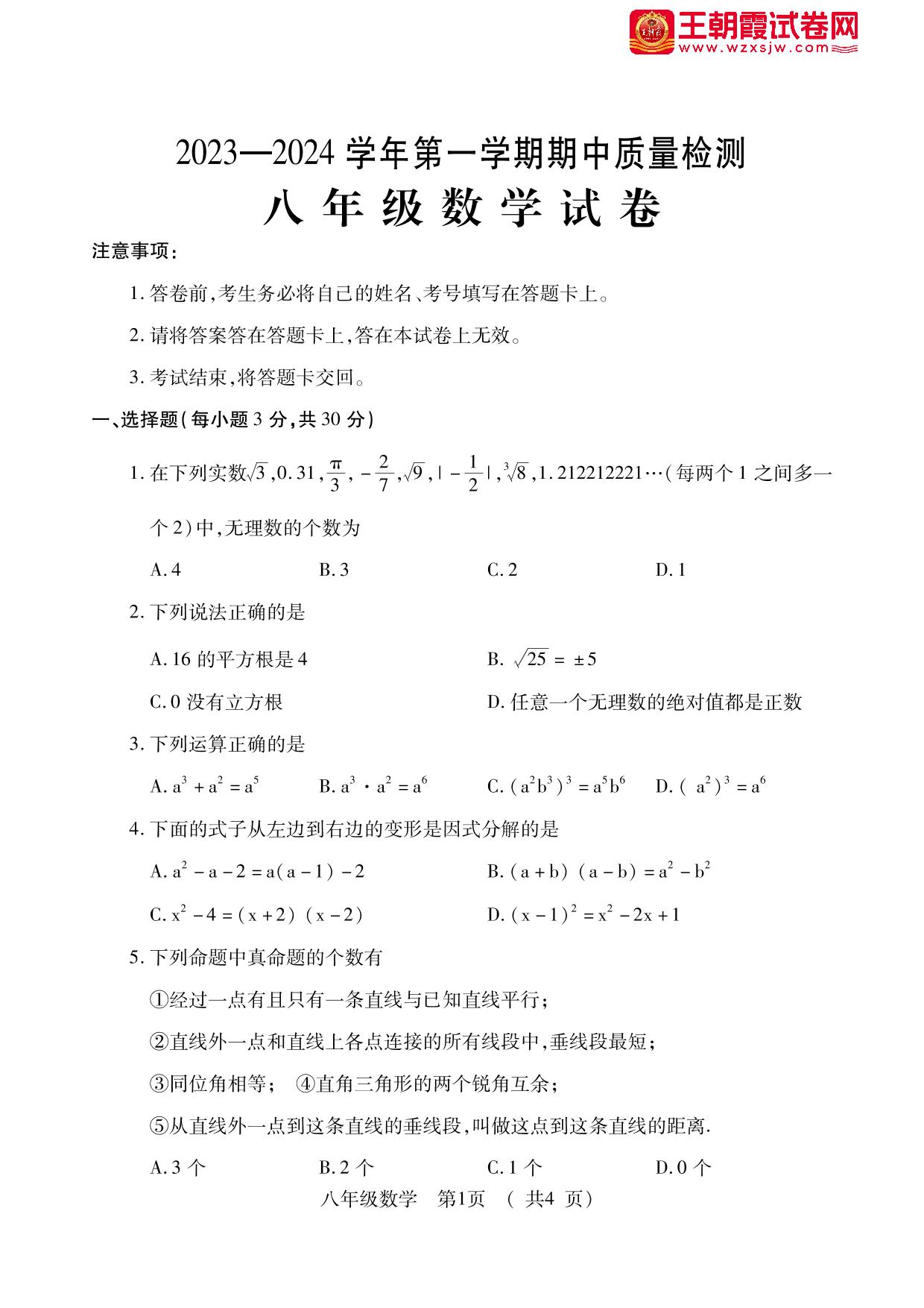 河南省洛阳市嵩县2023-2024学年第一学期期中质量检测试卷八年级数学(华师版)