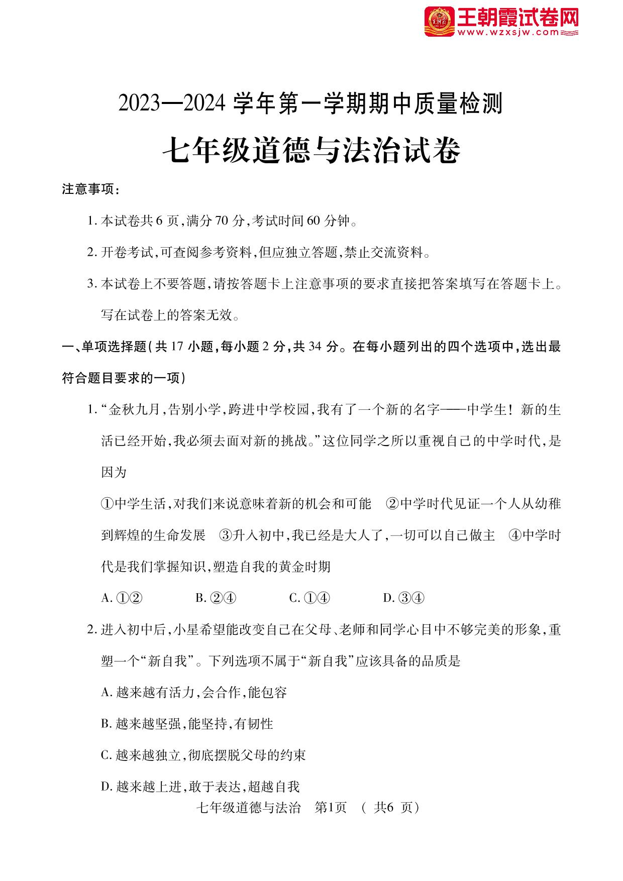 河南省洛阳市嵩县2023-2024学年第一学期期中质量检测试卷七年级道德与法治(人教版)