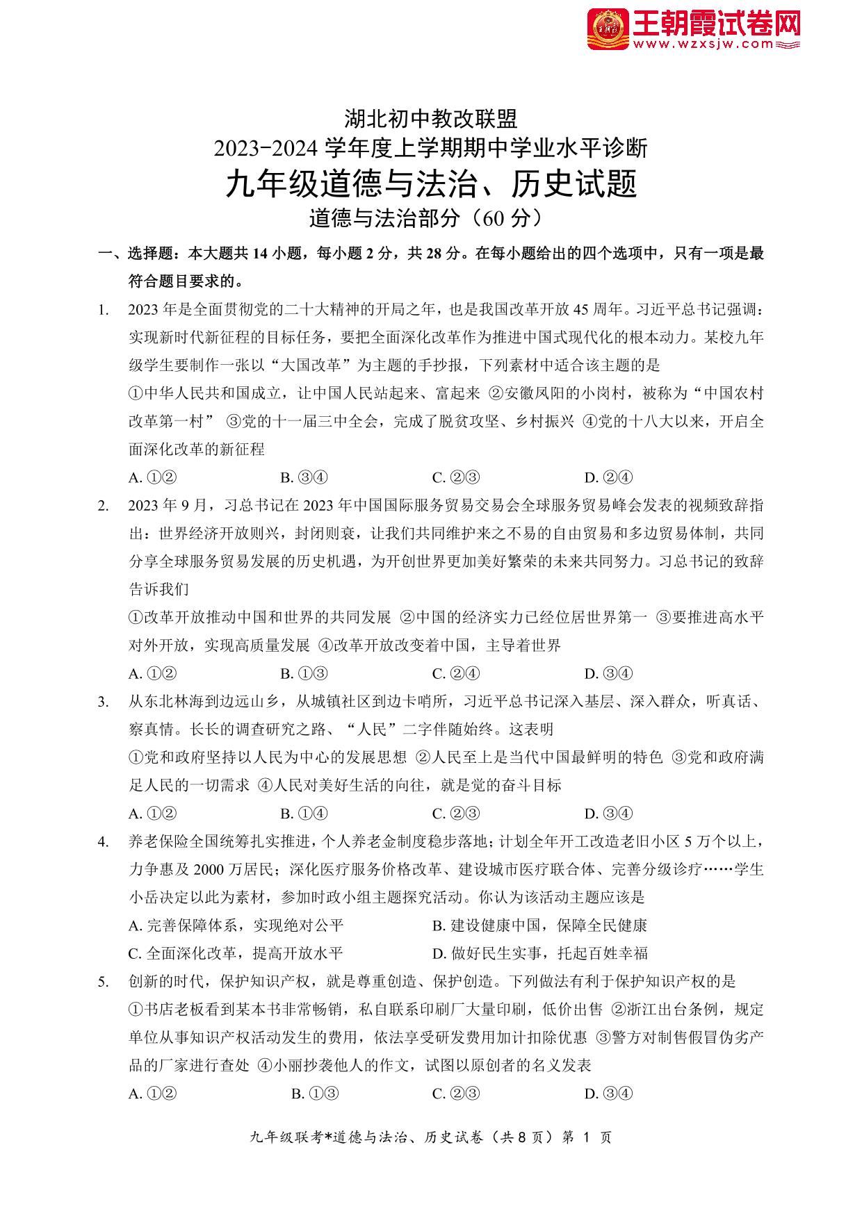湖北省初中教改联盟2023-2024学年度上学期期中学业水平诊断九年级考试道德与法治、历史综合卷(人教版)