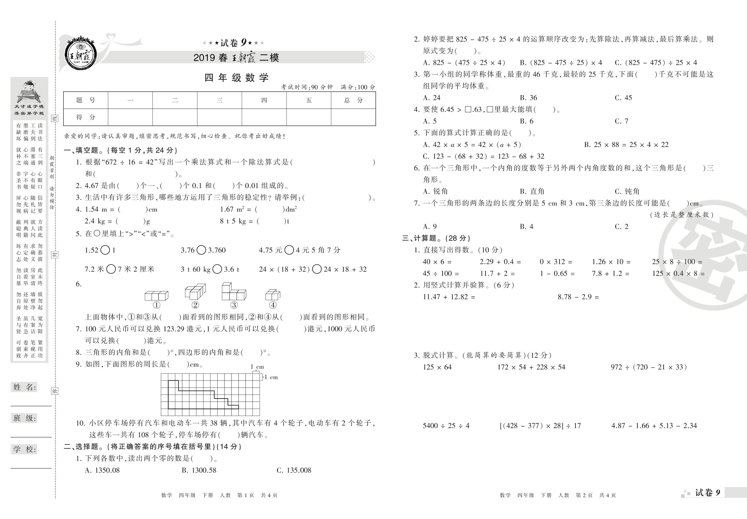 王朝霞期末模拟卷四年级下册数学(人教版)_R210804151128【9】