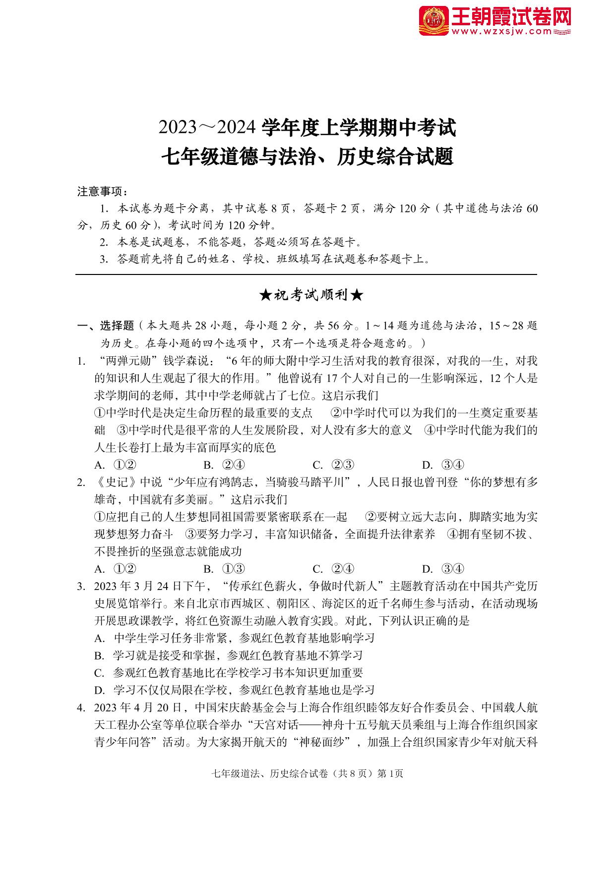 湖北省荆州市公安县、监利市2023-2024学年度上学期期中考试七年级道德与法治、历史综合试题(人教版)
