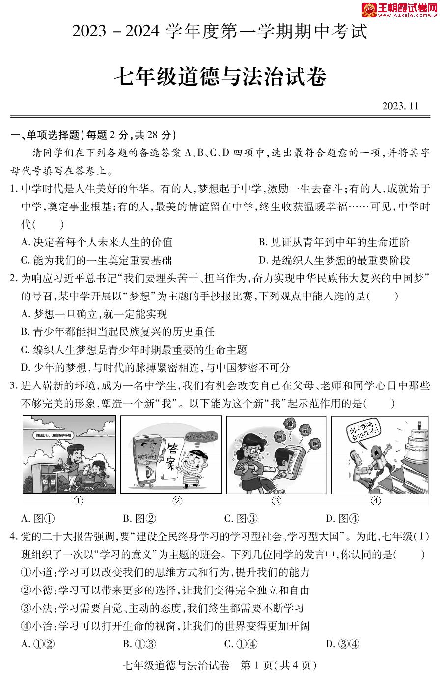 湖北省武汉市汉阳区2023-2024学年度第一学期期中考试七年级道德与法治(人教版)