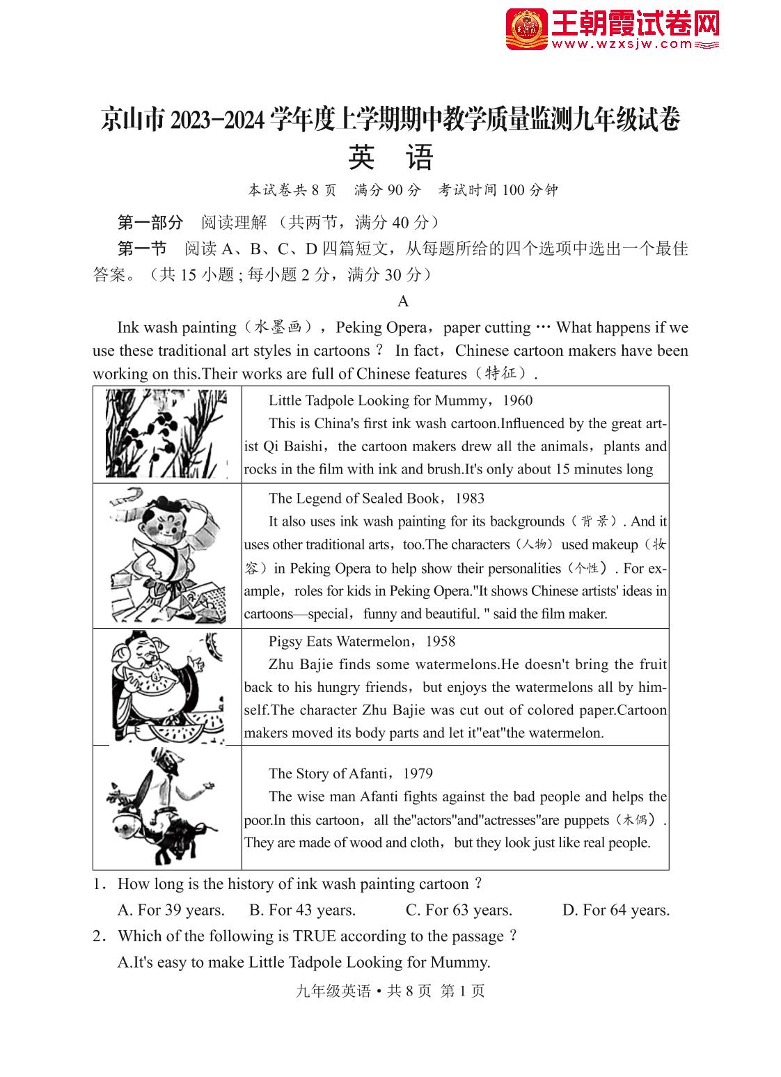 湖北省荆门市京山市2023-2024学年度上学期期中教学质量监测九年级英语(人教版)