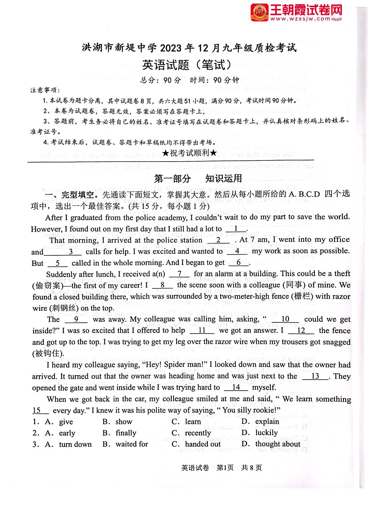 湖北省荆州市洪湖市新堤中学2023-2024学年上学期12月质检考试(月考)九年级英语(人教版)