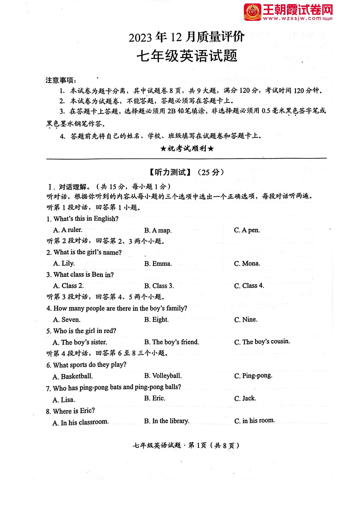 湖北省荆州市监利市2023-2024学年上学期12月质量评价(月考)七年级英语(人教版)【无听力音频】