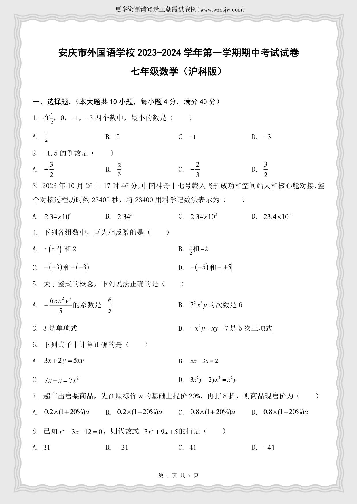 安徽省安庆市外国语学校2023-2024学年第一学期期中考试试卷七年级数学(沪科版)