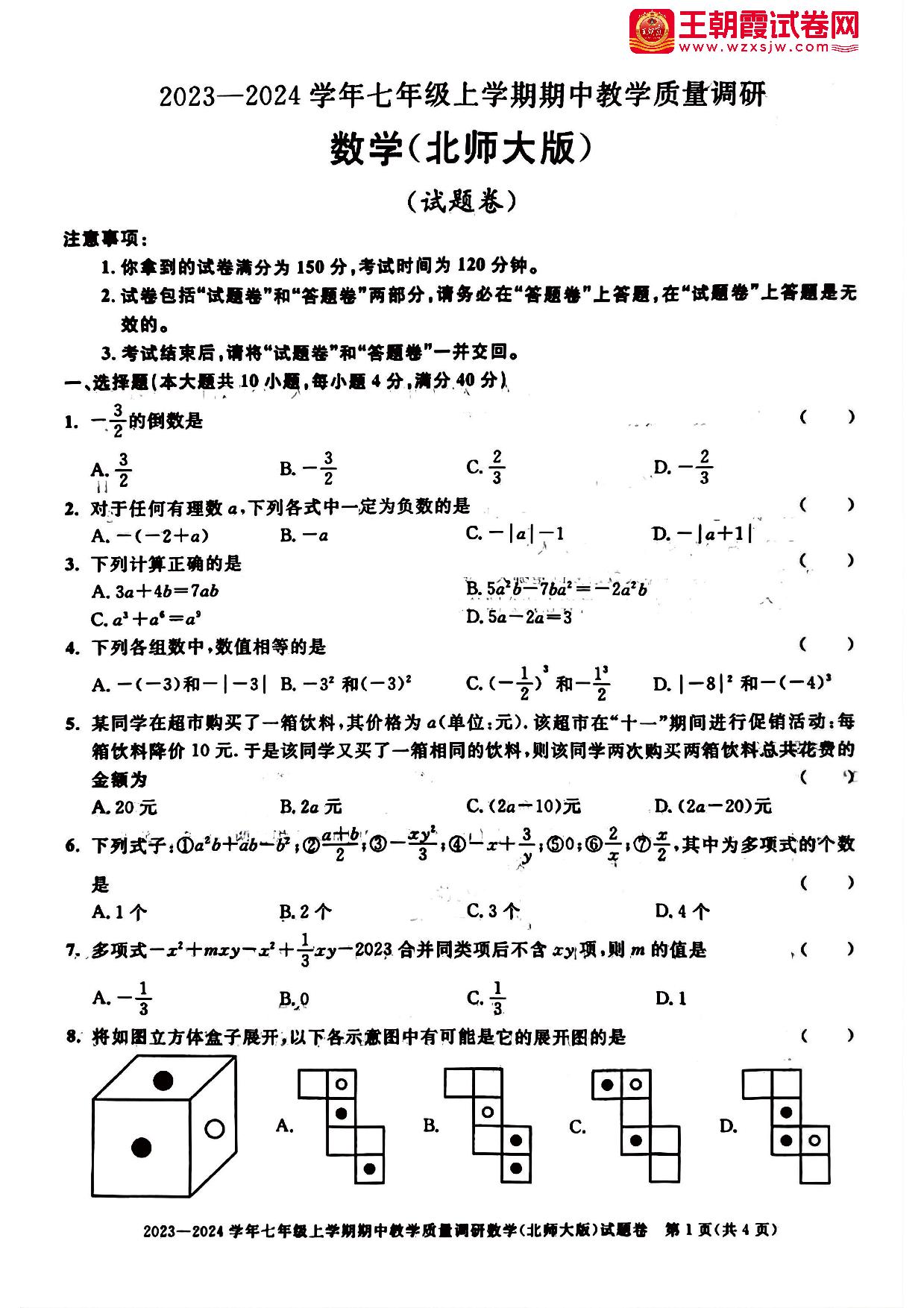 七年级数学北师版上册期中卷