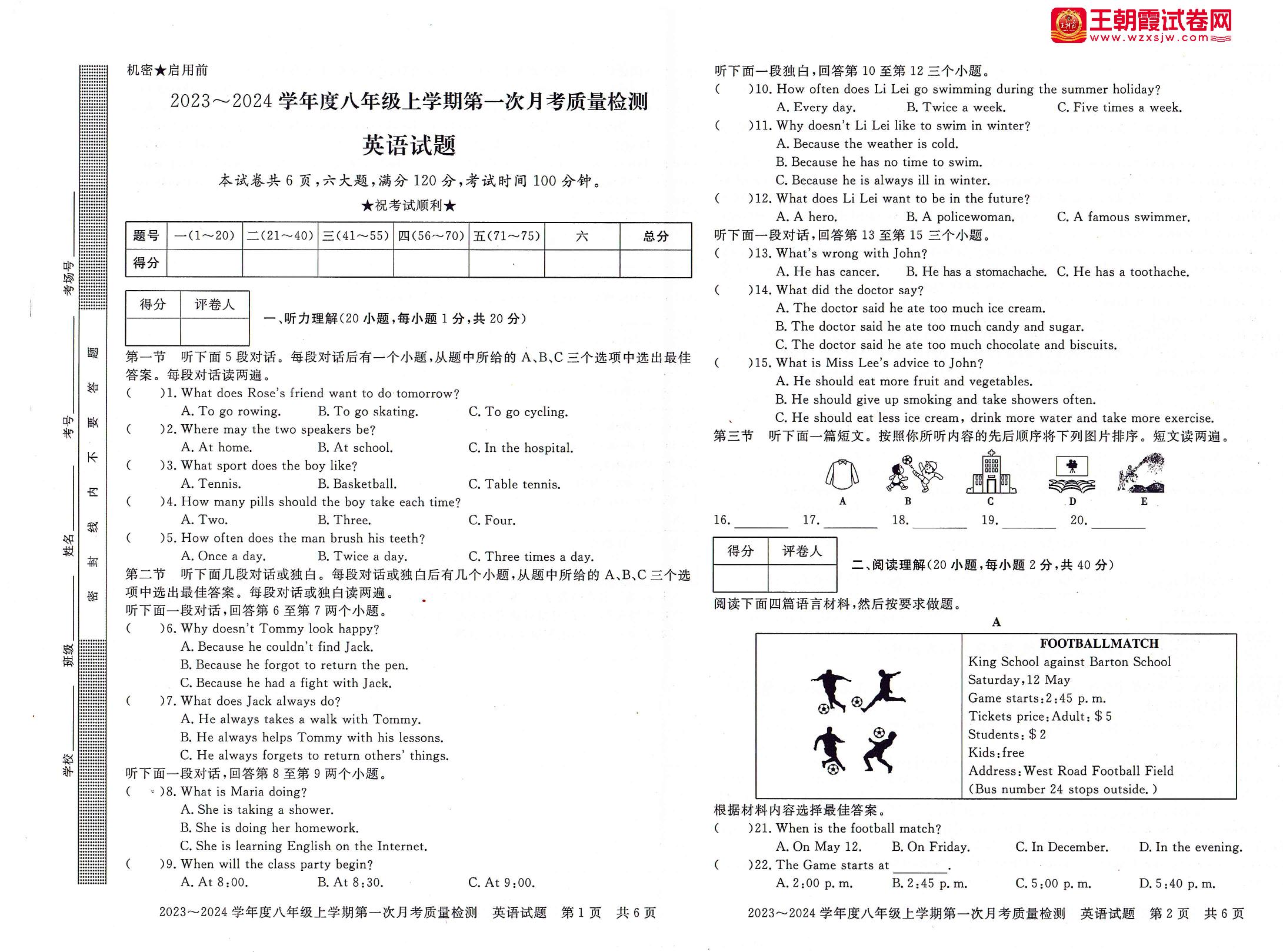 河南省信阳市平桥区2023-2024学年度上学期第一次月考质量检测试题八年级英语(新课标版)