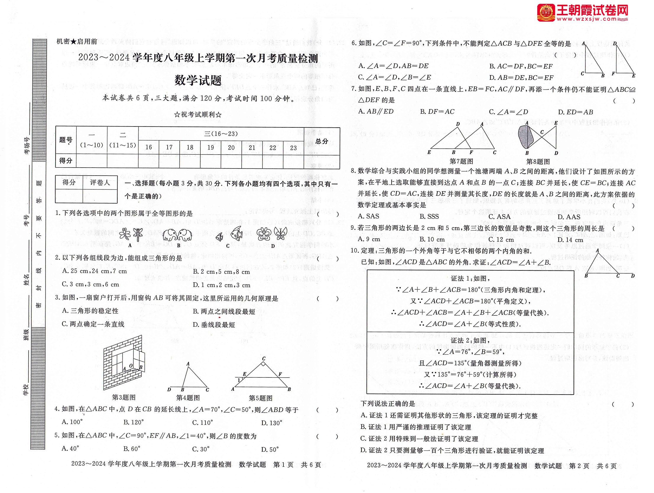 河南省信阳市平桥区2023-2024学年度上学期第一次月考质量检测试题八年级数学(人教版)
