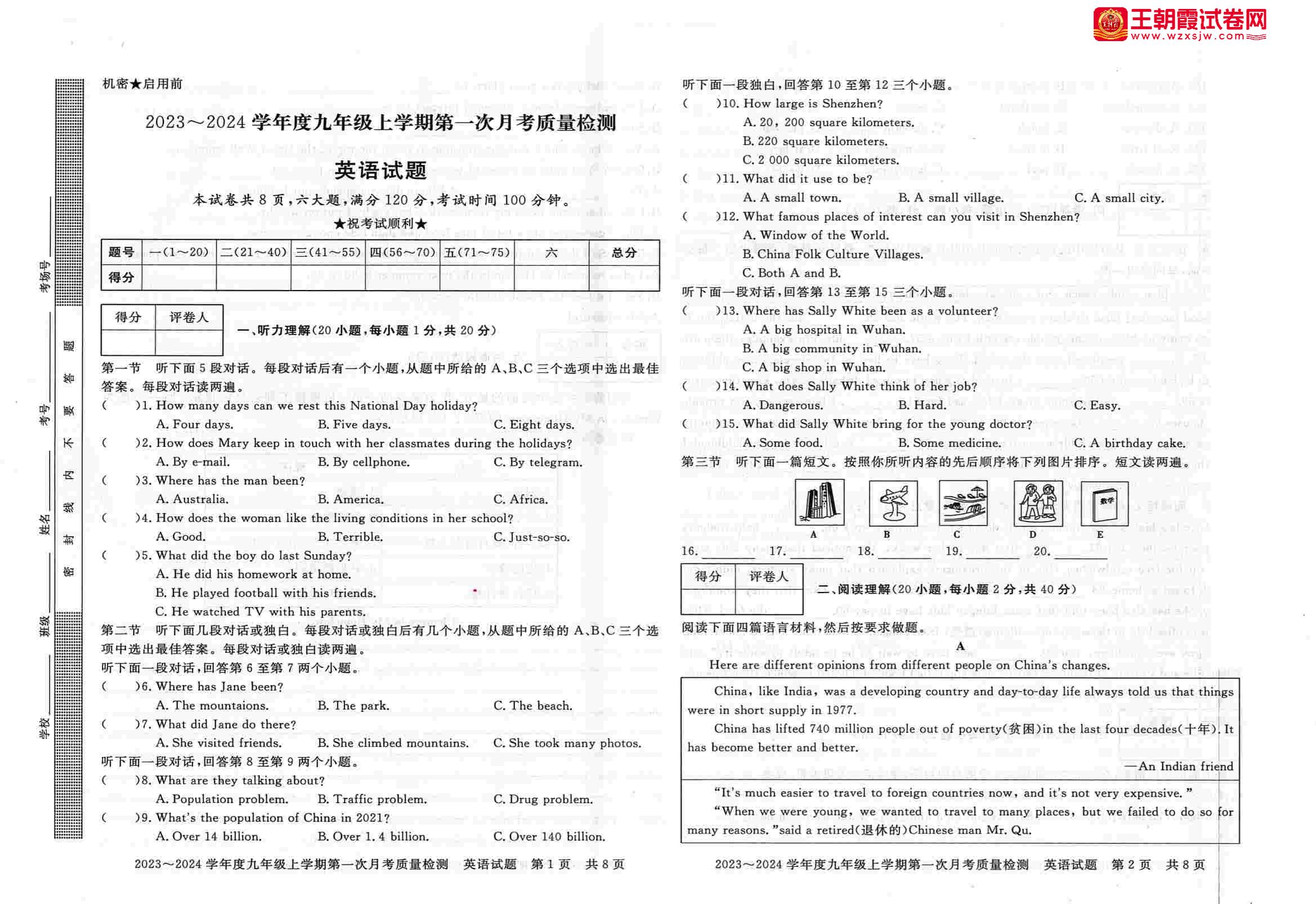 河南省信阳市平桥区2023-2024学年度上学期第一次月考质量检测试题九年级英语(新课标版)