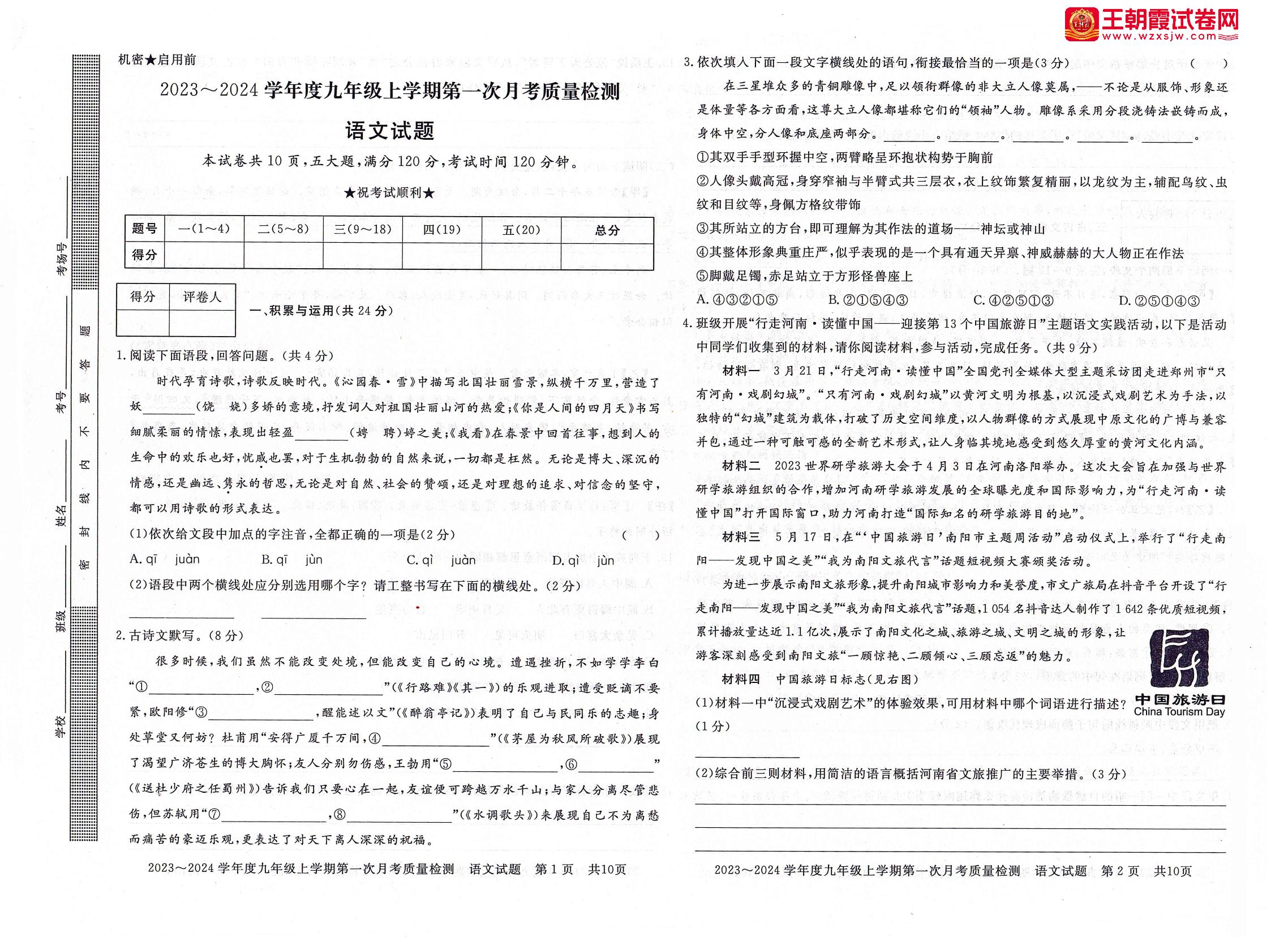 河南省信阳市平桥区2023-2024学年度上学期第一次月考质量检测试题九年级语文(人教版)