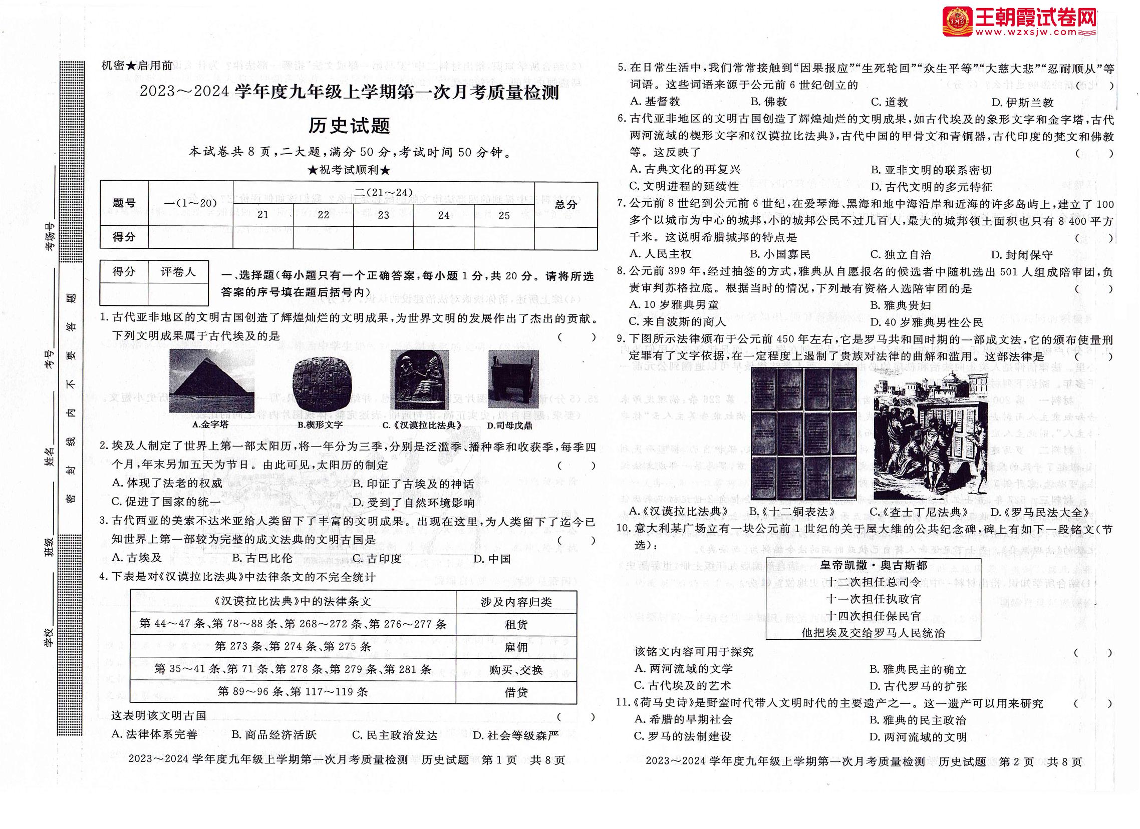 河南省信阳市平桥区2023-2024学年度上学期第一次月考质量检测试题九年级历史(人教版)