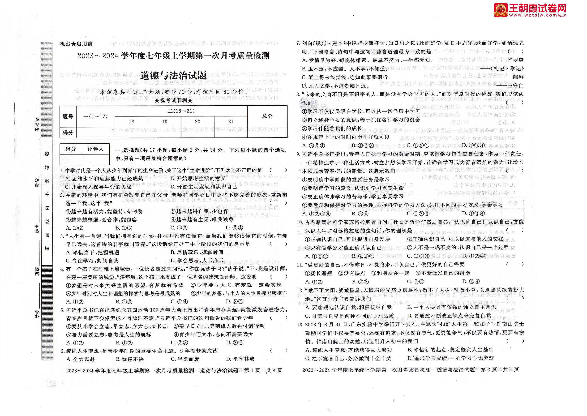 七年级道德与法治人教版上册月考卷