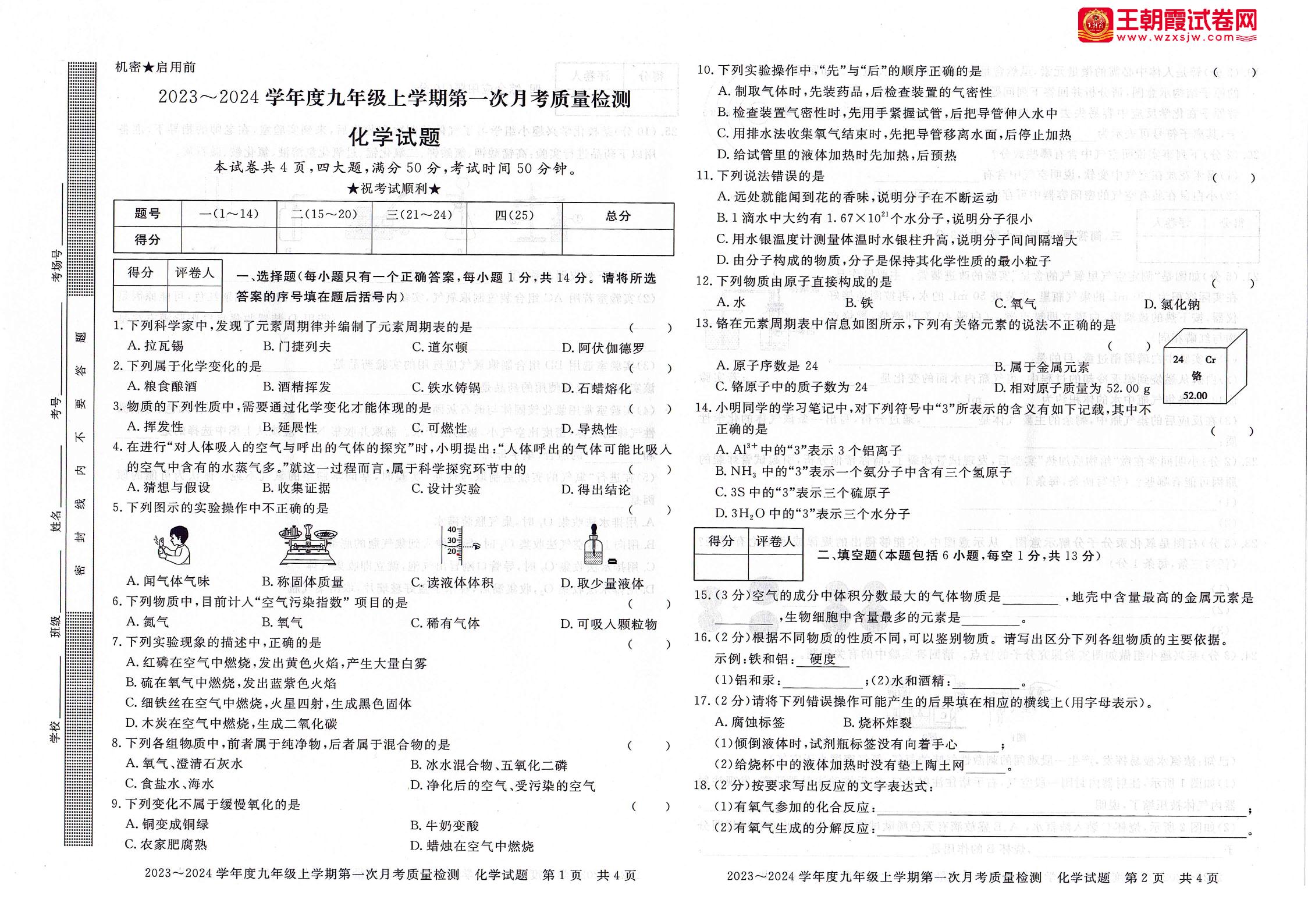 河南省信阳市平桥区2023-2024学年度上学期第一次月考质量检测试题九年级化学(人教版)