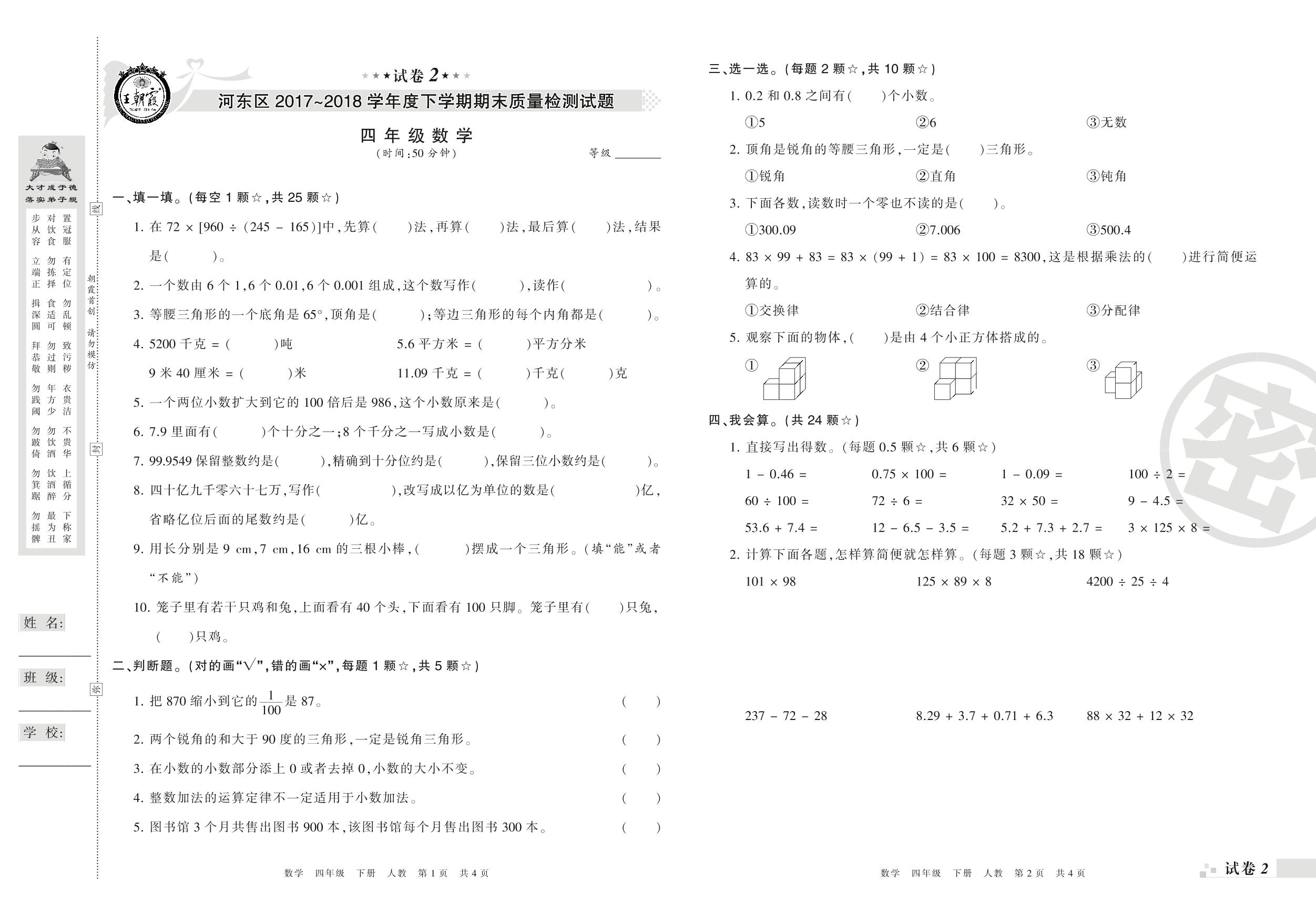 2017-2018学年第二学期临沂市河东区四年级数学试卷(人教版)【2】