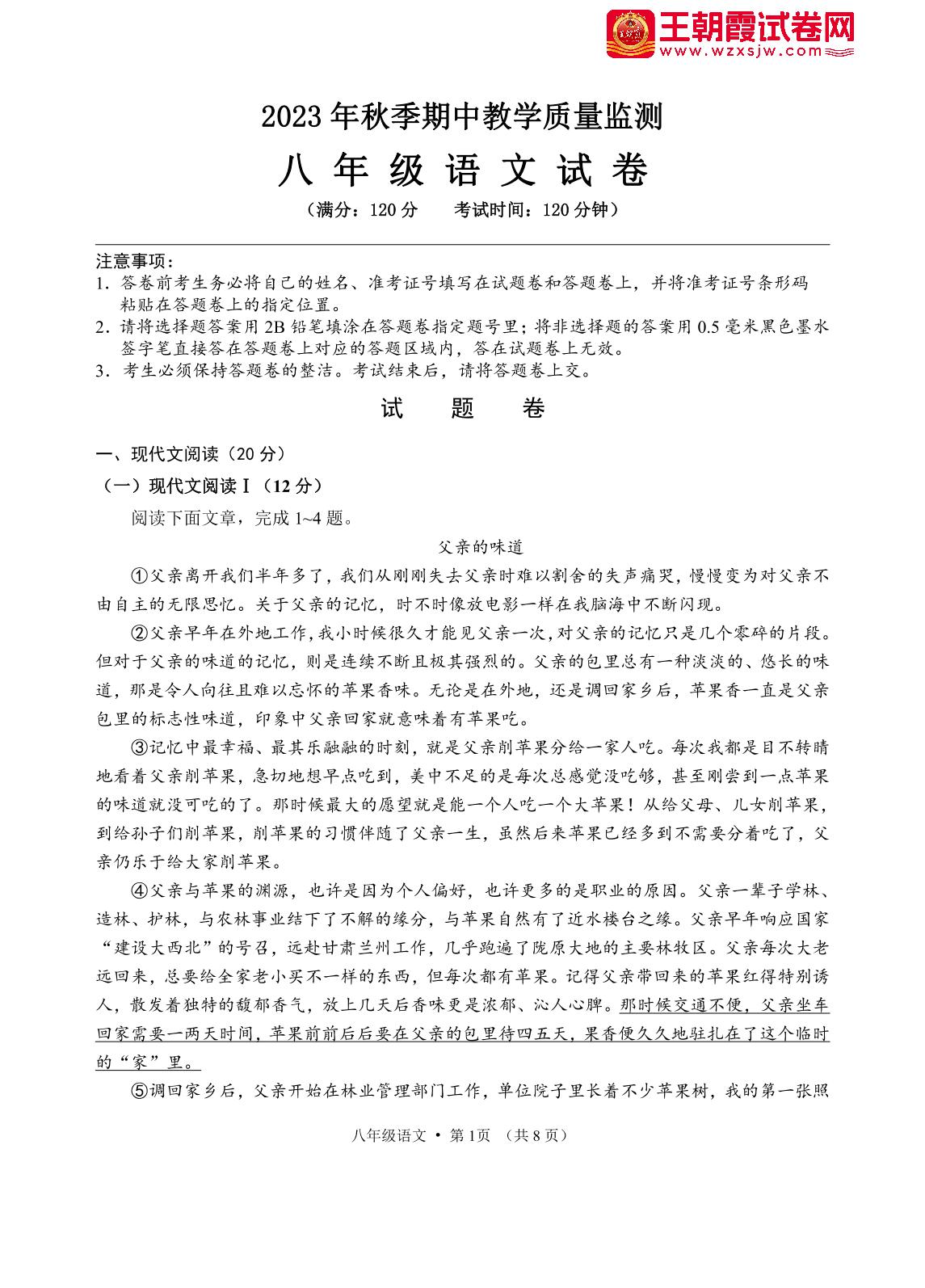 湖北省咸宁市嘉鱼县、赤壁市联考2023-2024学年上学期期中教学质量监测八年级语文(人教版)