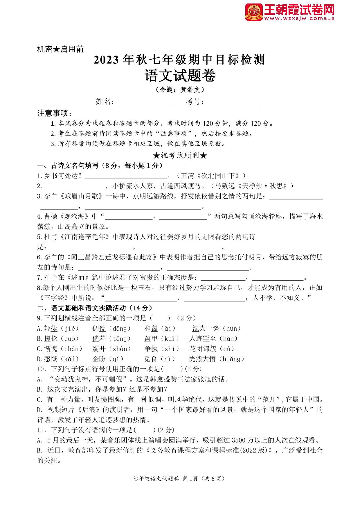 湖北省黄石市大冶市2023-2024学年上学期期中目标检测七年级语文(人教版)