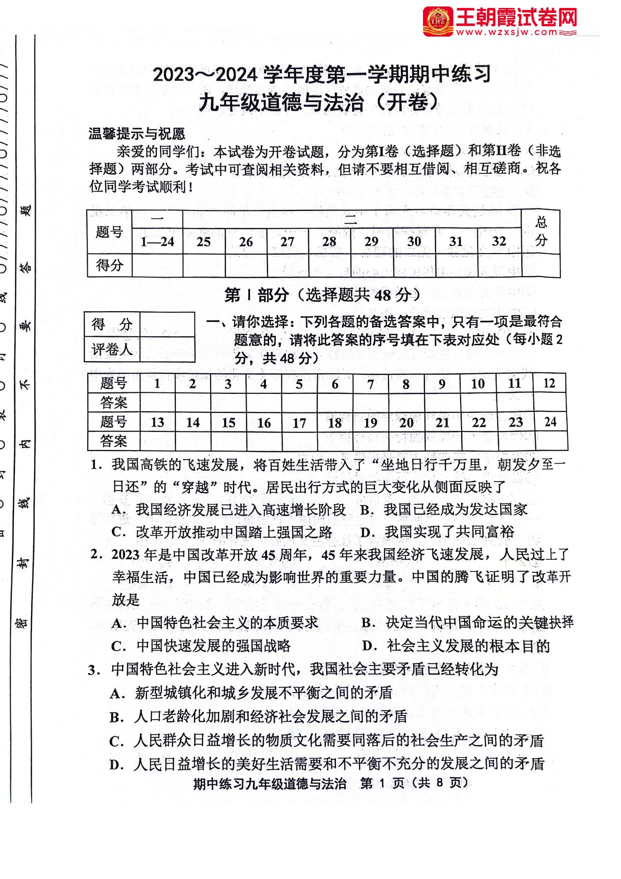 天津市部分区2023~2024学年度第一学期期中练习九年级道德与法治(人教版)