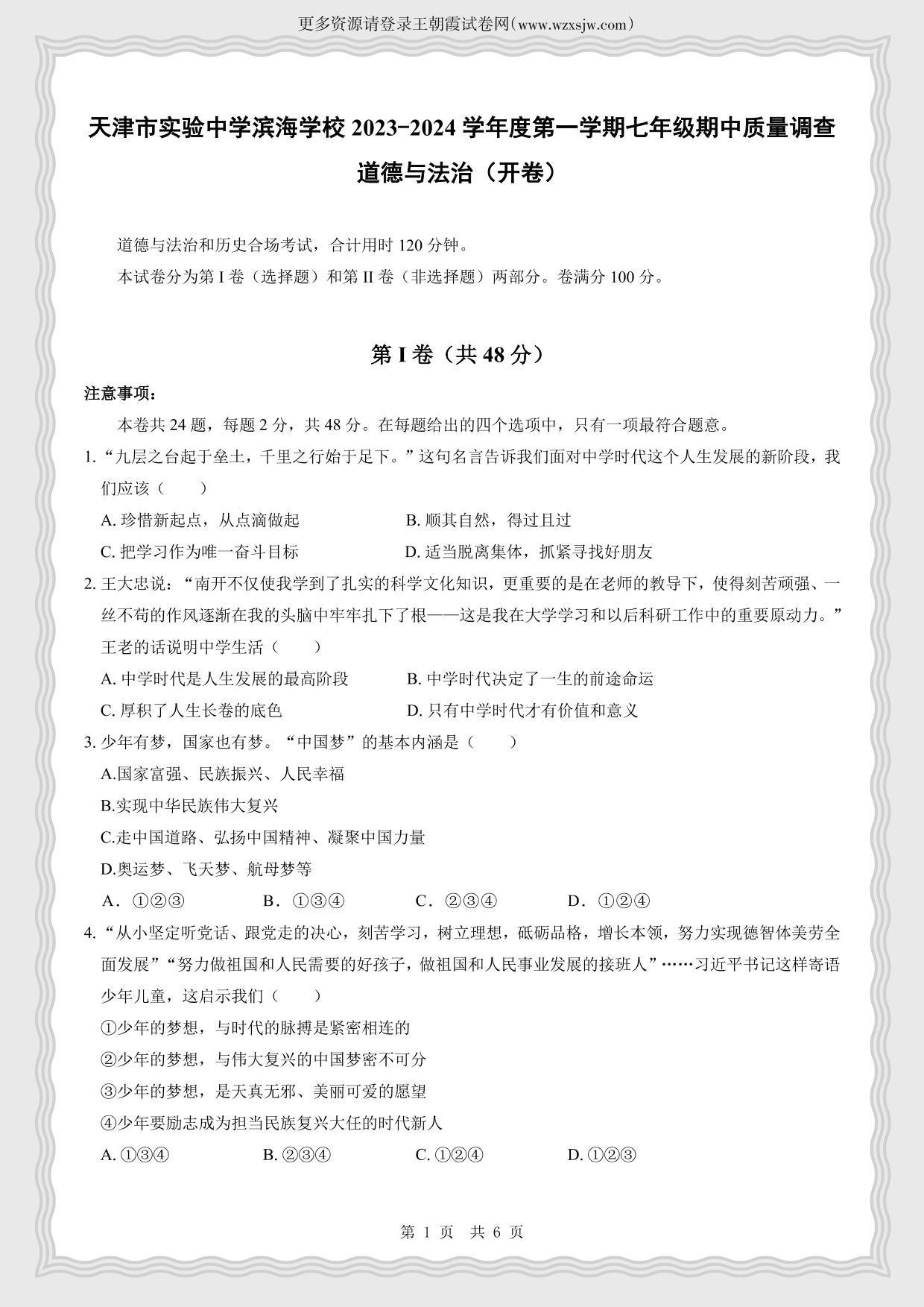 天津市实验中学滨海学校2023-2024学年第一学期期中质量调查试题七年级道德与法治(人教版)