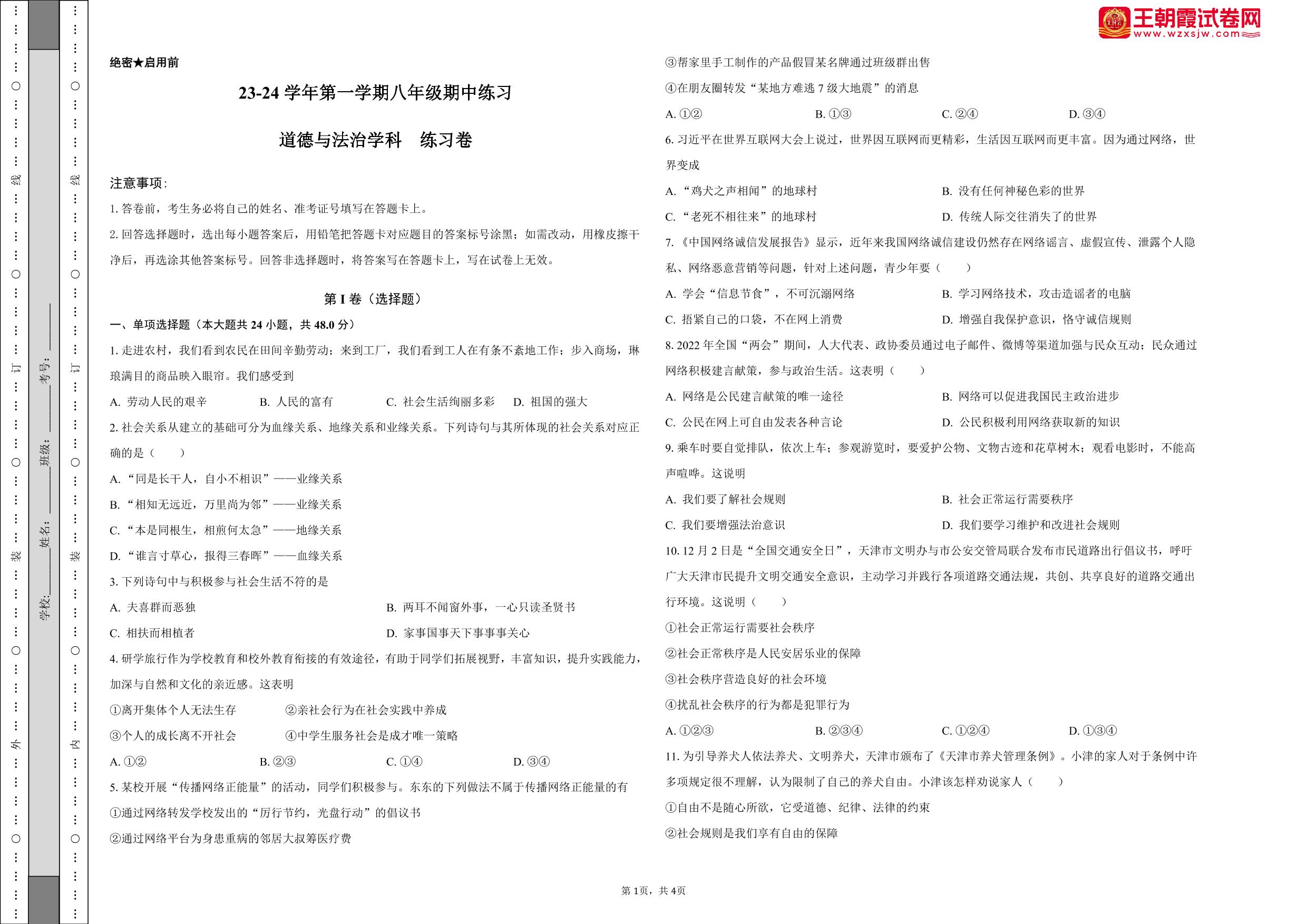 天津市津南区南部学片联考2023-2024学年第一学期期中练习卷八年级道德与法治(人教版)
