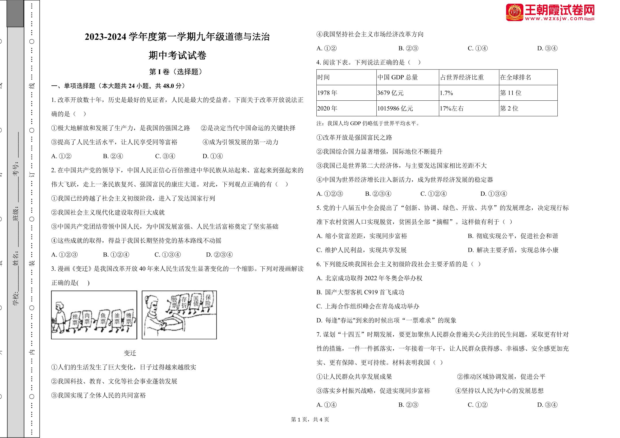 天津市第七中学2023-2024学年度第一学期期中考试试卷九年级道德与法治(人教版)