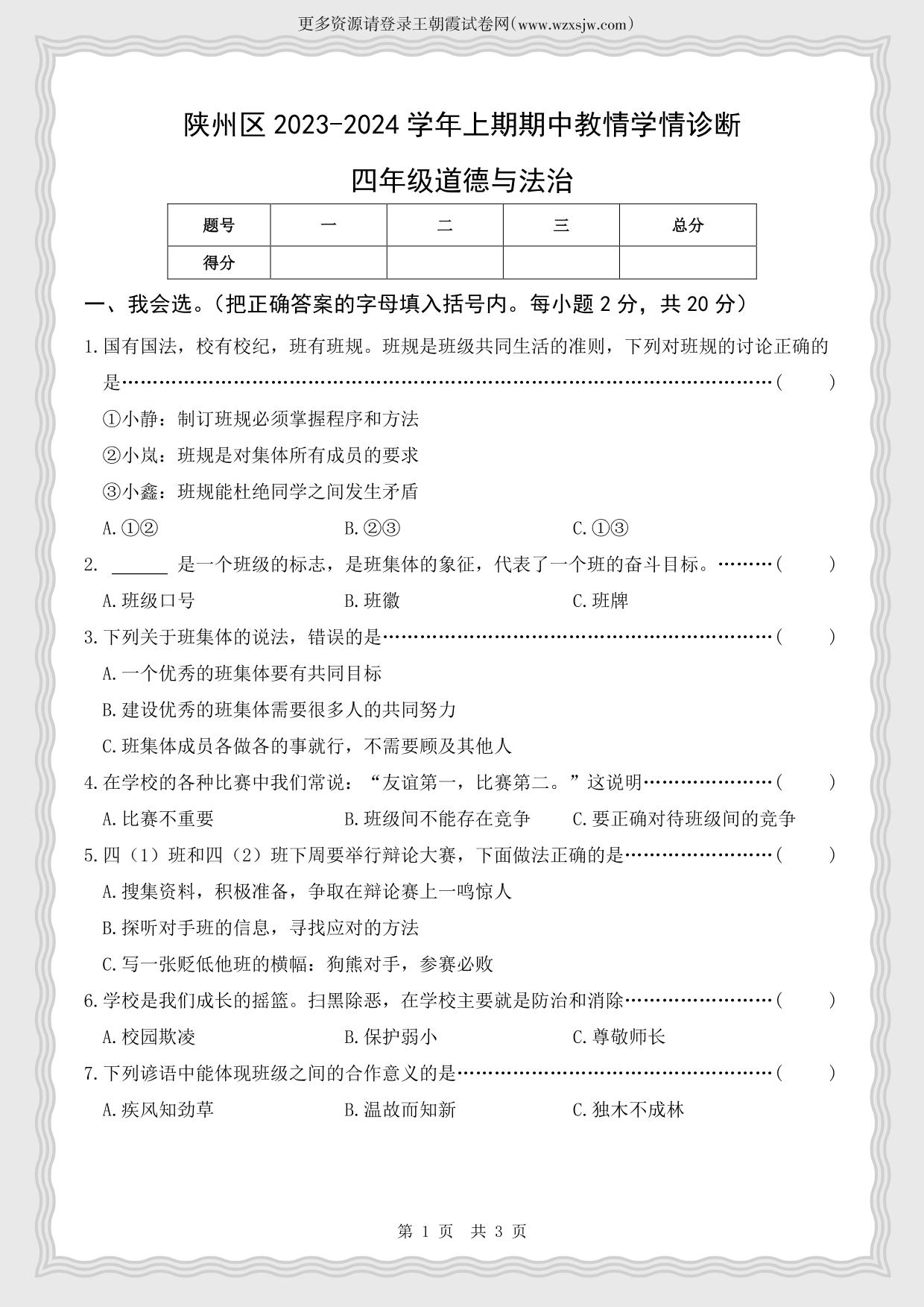 河南省三门峡市陕州区2023-2024学年上学期期中教情学情诊断试卷四年级道德与法治(人教版)