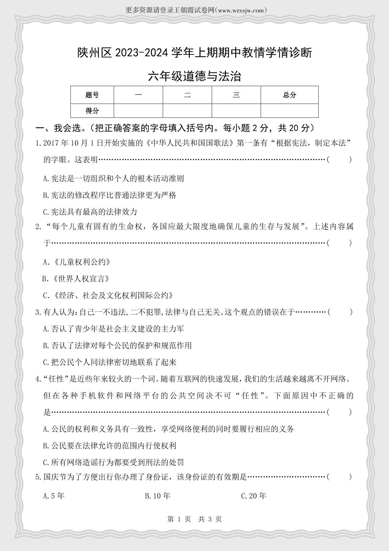 河南省三门峡市陕州区2023-2024学年上学期期中教情学情诊断试卷六年级道德与法治(人教版)