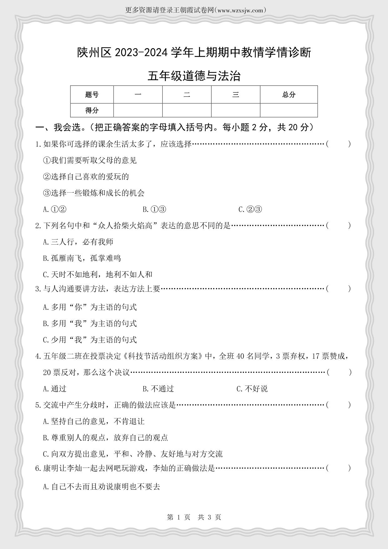河南省三门峡市陕州区2023-2024学年上学期期中教情学情诊断试卷五年级道德与法治(人教版)