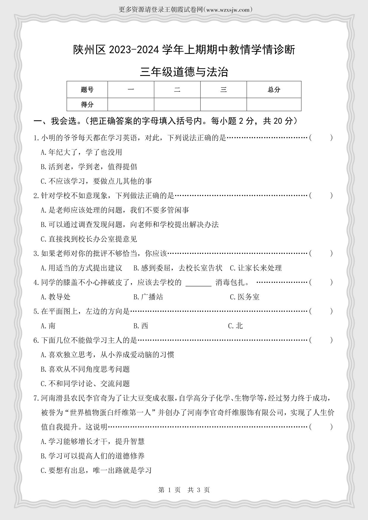 河南省三门峡市陕州区2023-2024学年上学期期中教情学情诊断试卷三年级道德与法治(人教版)