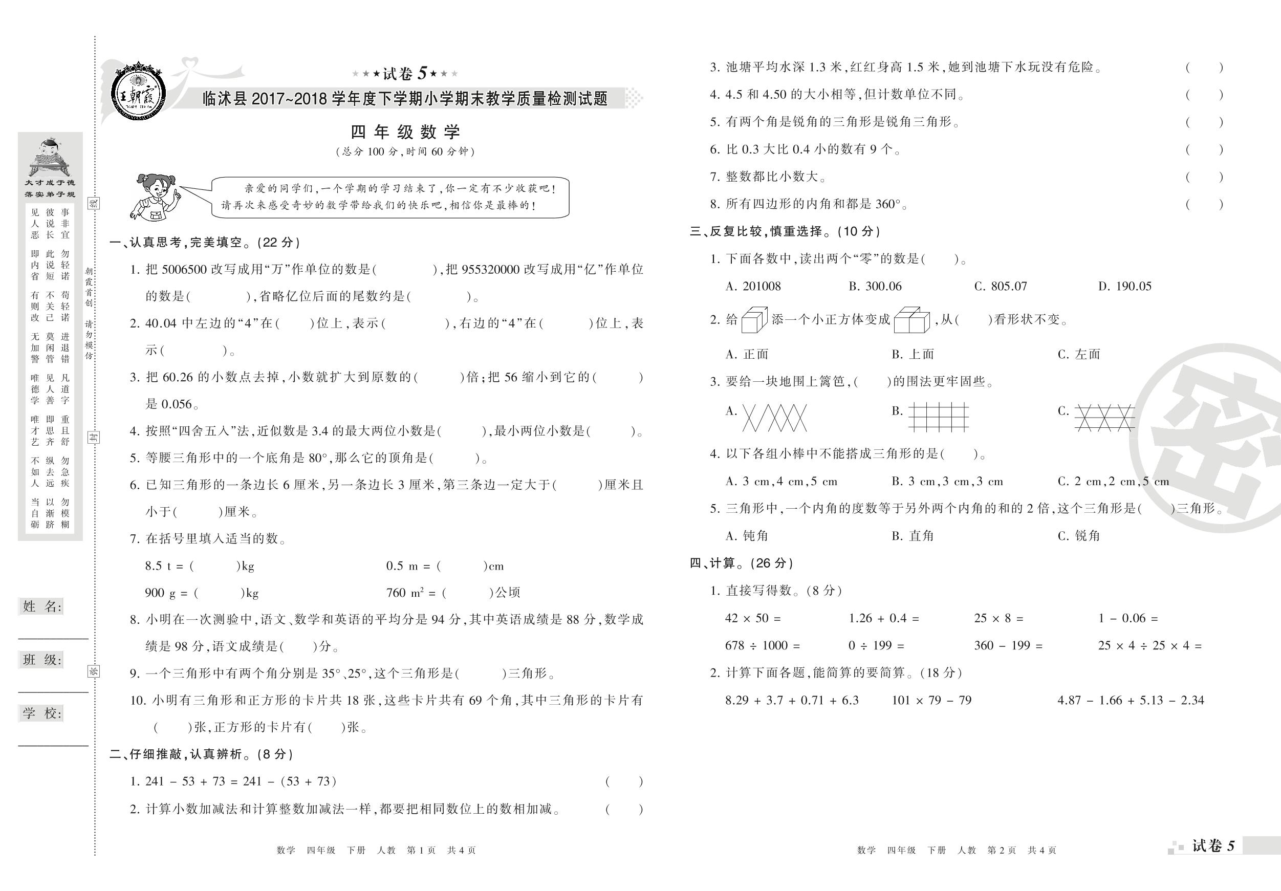 2017-2018学年第二学期临沂市临沭县四年级数学试卷(人教版)【5】