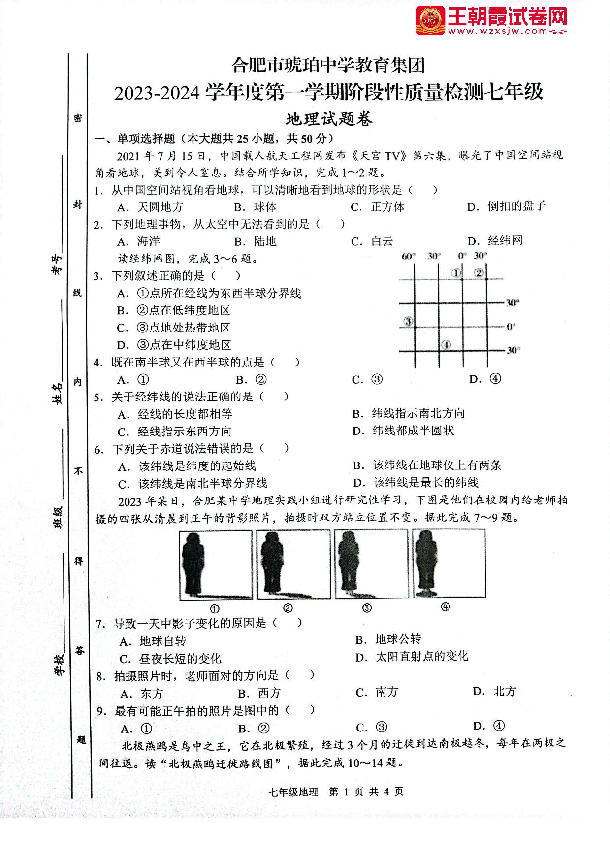 安徽省合肥市琥珀中学教育集团2023-2024学年度第一学期(期中)阶段性质量检测七年级地理(星球版)