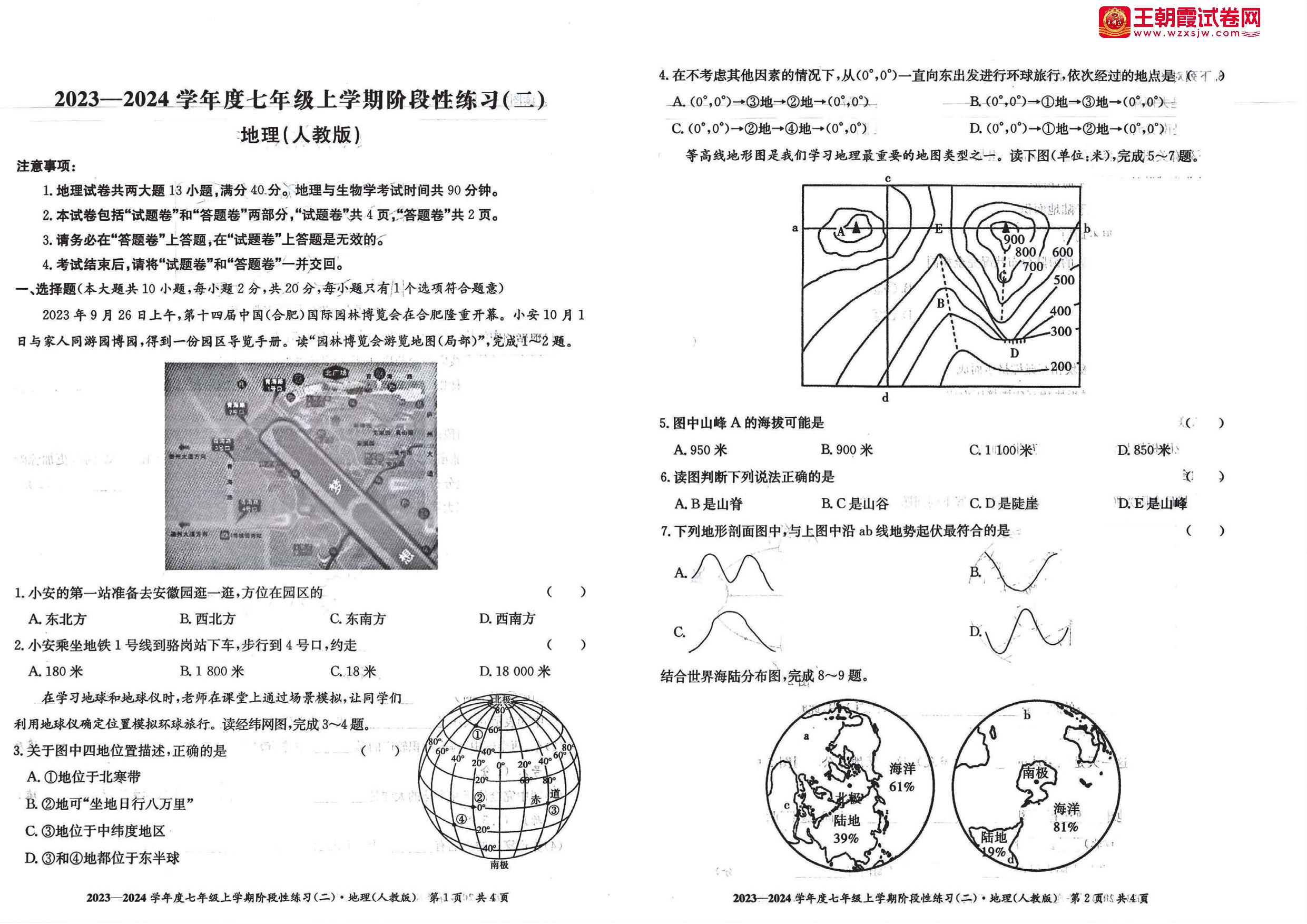 安徽省阜阳市临泉县2023-2024学年上学期(期中)阶段性练习七年级地理(人教版)