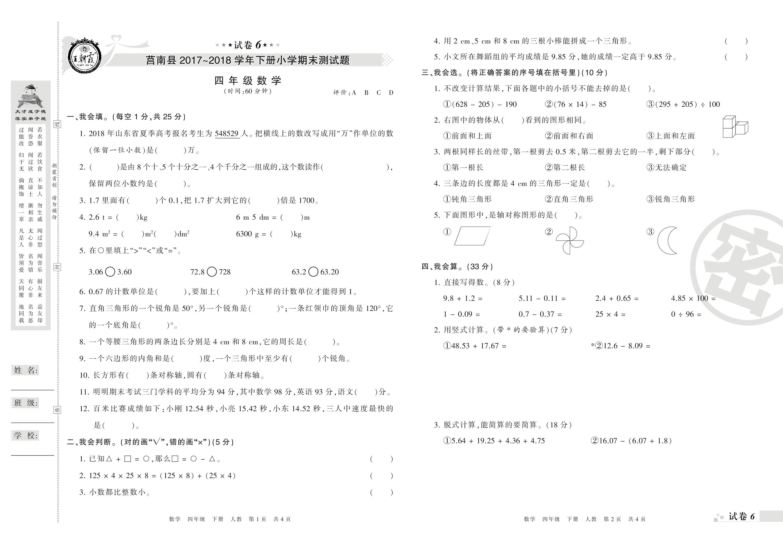 2017-2018学年第二学期临沂市莒南县四年级数学试卷(人教版)【6】