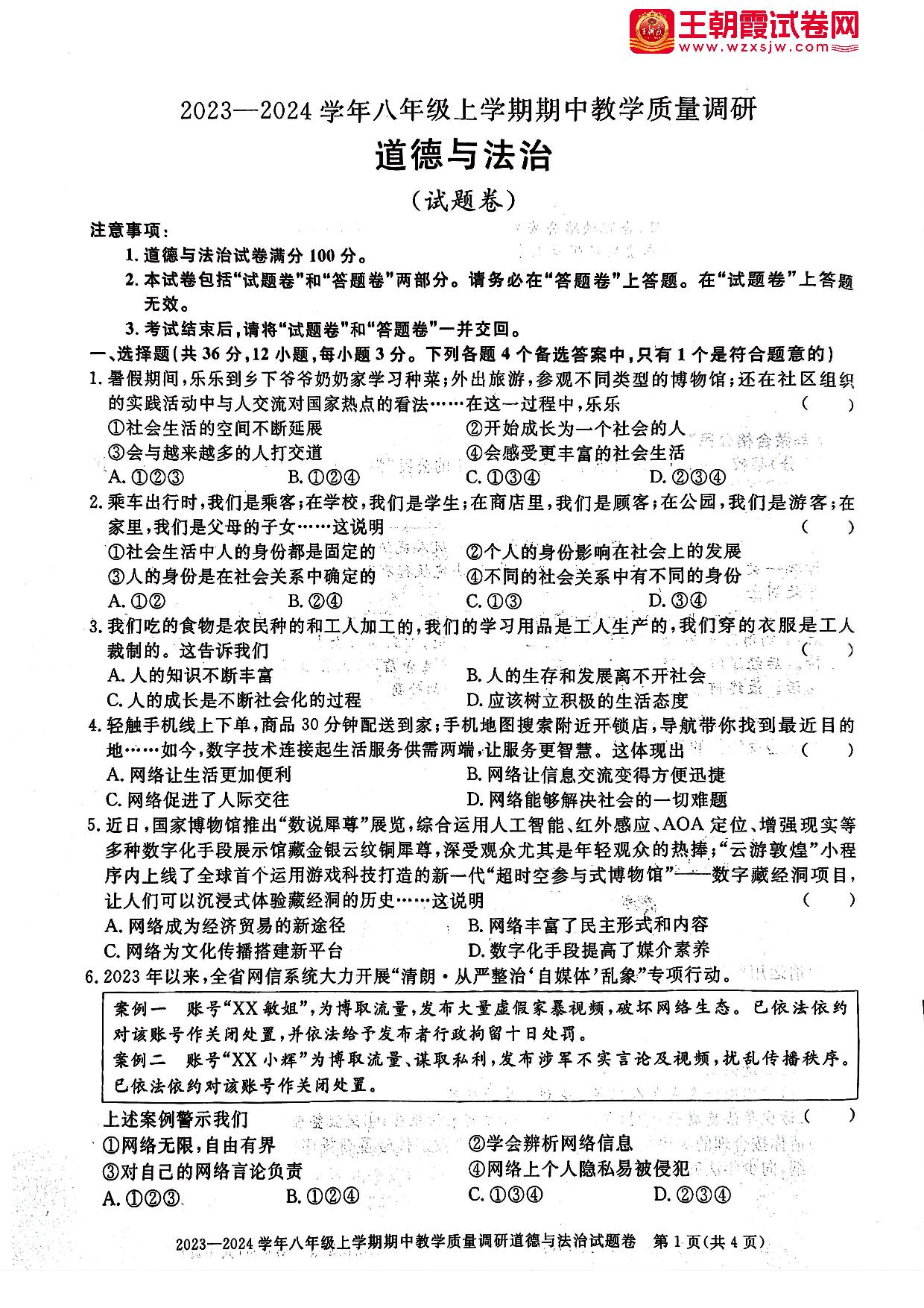 安徽省六安市霍邱县2023-2024学年上学期期中教学质量调研八年级道德与法治(人教版)